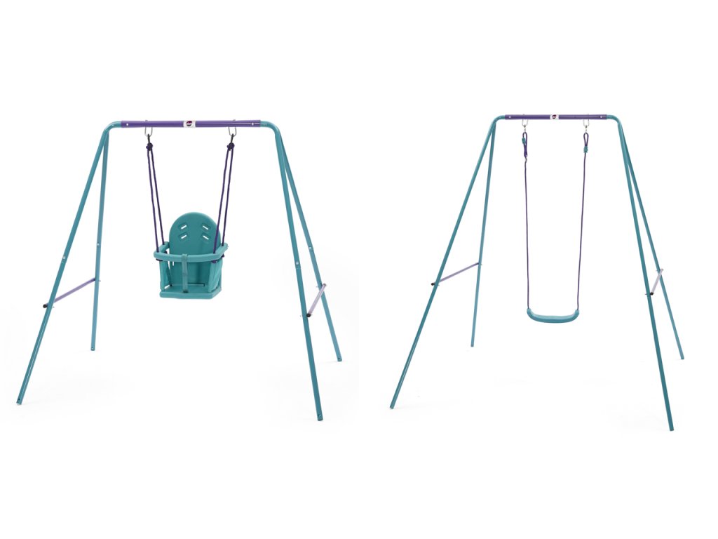 A PLUM® fémből készült hinta szett együtt növekszik gyermekével. Két cserélhető ülőke tartozik hozzá – egy babafotel, amely 12 hónapos kortól alkalmas, magas háttámlával, biztonsági övvel és csúszásgátló T-pánttal, valamint egy műanyag hintaülés idősebb gyermekek számára. Mindkét ülés kötéllel rendelkezik, amelynek hossza a gyermek magasságának megfelelően állítható. A masszív fémváz porszórt acélból készült, ami biztosítja a hosszú élettartamot és a korrózió elleni védelmet. A csomag része a hinta biztonságos rögzítéséhez szükséges talajhorgony. A maximális teherbírás 45 kg. A hinta kizárólag kültéri és otthoni használatra szolgál. Mindig felnőtt felügyelete mellett használja. Méretek összeszerelés után: 181 x 171 x 164 cm. Ülés minimális magassága a talajtól: 200 mm (alsó pozíció), 350 mm (felső pozíció). Életkor: 12 hónapos kortól+