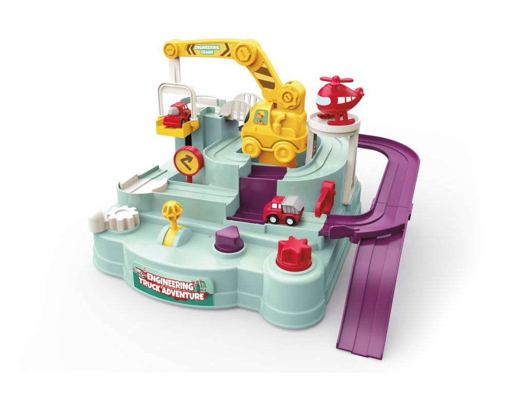 Pálya akadályokkal. Méretek 24x24x17 cm. Autó méretei 3,5x2,5x3,5 cm. 4 vezérlő (kerekek, karok). Tartozék 2 autó. Életkor: 3+