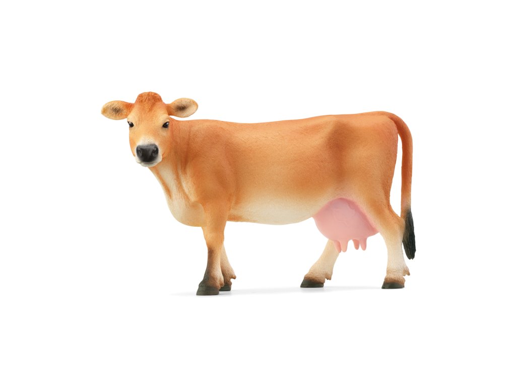 A Jersey tehén fekete szemével barátságos pillantást vet a látogatókra a legelő kerítésénél. Azonnal odalovagol, mert nagyon bizakodó. A jó barátok még annyira is megközelíthetik, hogy megsimogathassák sárgás bundáját. Nagyon szereti az ilyen simogatást. Finoman az orrával megbökdösik a kezüket: Ne hagyd abba! Csak 1,20 m magas, és így sokkal kisebb, mint sok más szarvasmarhafajta. A csordával együtt legszívesebben a legelőn áll, ahol mindig friss új füvet talál. Mindenki élvezi ezeket a rendszeres látogatásokat. A figura méretei: 8 x 14 x 4 cm. Életkor: 3+