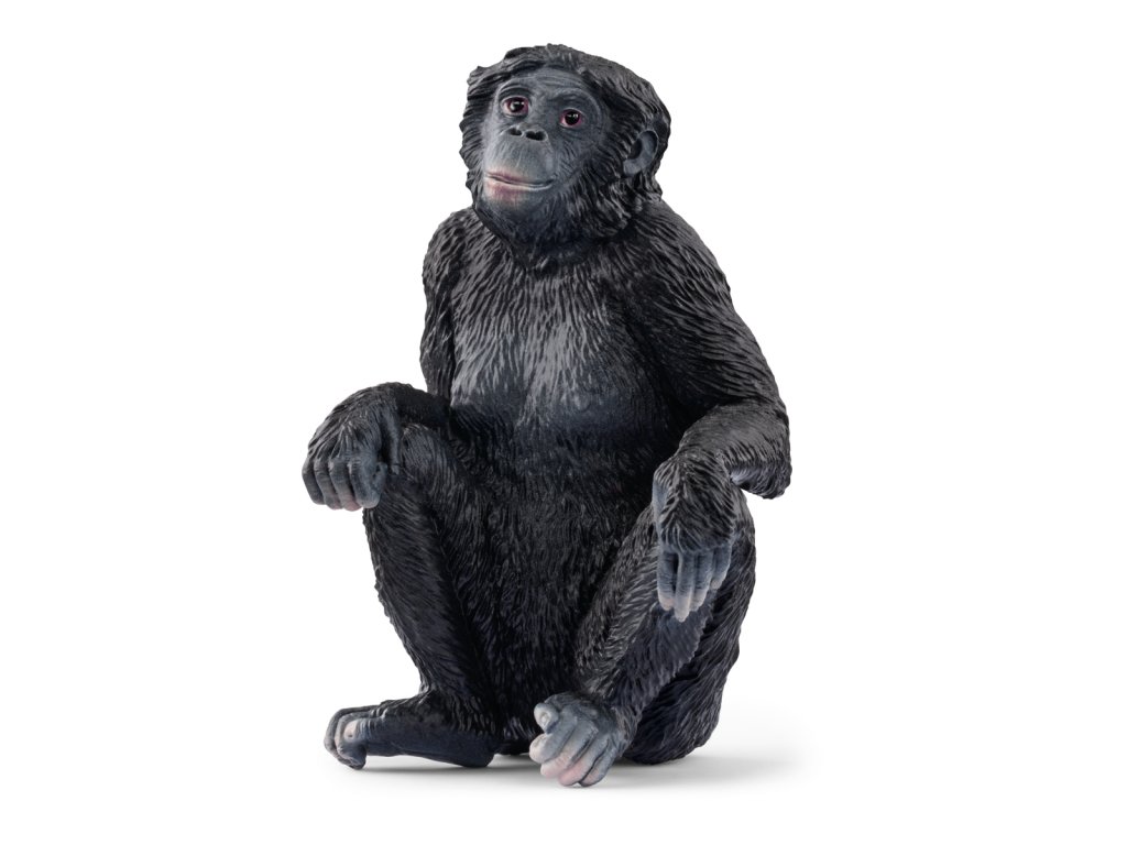 A Bonobo csimpánz nőstény éppen délutáni szünetet tart? Csak ül és a térdére támasztja a kezét. Talán csak a játékos barátaira vágyik. A bonobó csimpánzok nagyon társaságkedvelők, és nem szeretik, ha egyedül vannak. A bonobó csimpánz nőstény legszívesebben a családjával és természetesen a barátaival tölti az idejét. Hová tűntek mindannyian? Talán hamarosan talál valakit, aki társaságot nyújt neki. Csomagolási méretek: 6 x 4 x 4,2 cm. Életkor: 3+