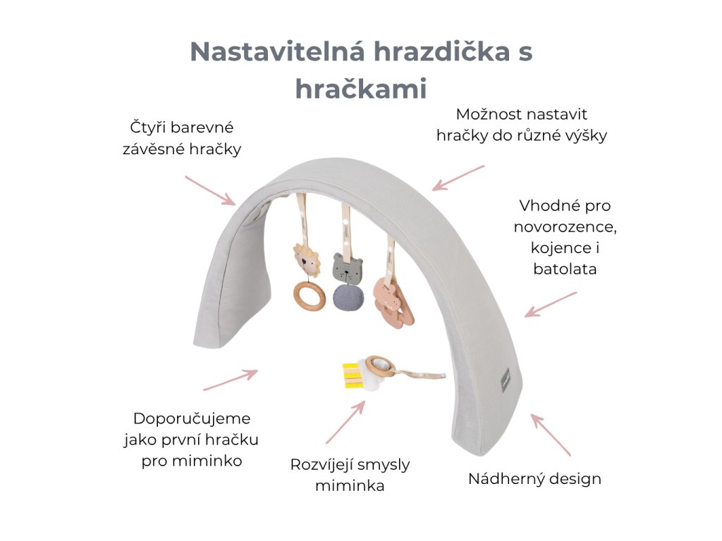 Az állítható akasztópántok lehetővé teszik, hogy a játékokat különböző magasságokba állítsa, és a baba igényeihez igazítsa. Újszülöttek számára javasoljuk, hogy a játékokat a has magasságában helyezzék el, hogy elérjék azokat anélkül, hogy fel kellene emelniük a fejüket. Ez fontos a gerinc megfelelő fejlődéséhez.