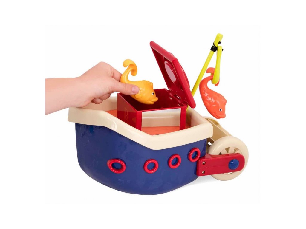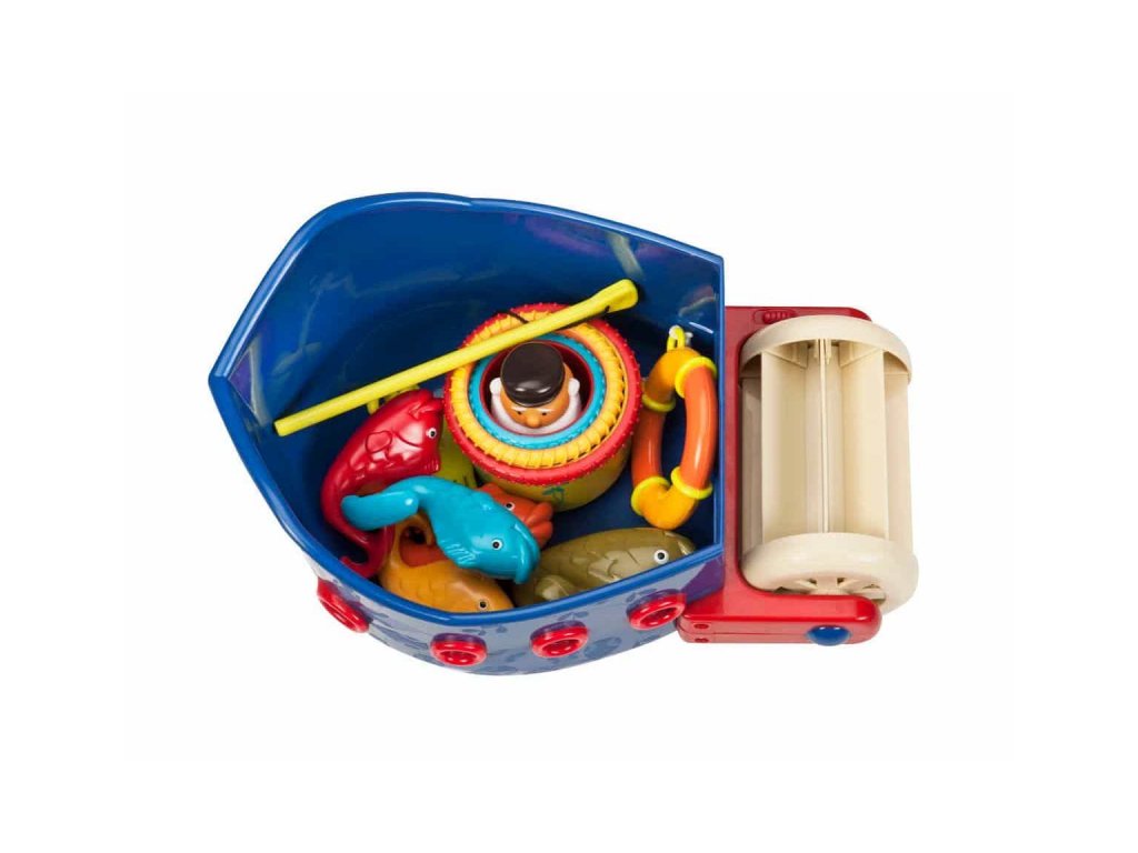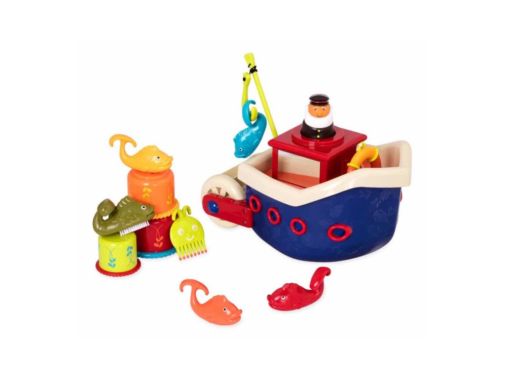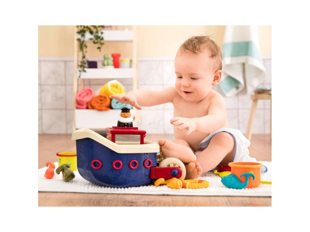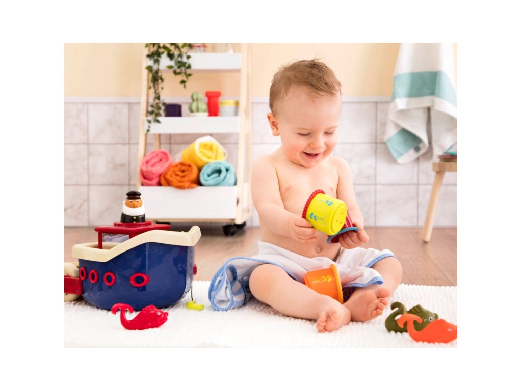 Loď s kapitánom Fish & Splish od Btoys – 6 hónapos és 3 éves kor közötti gyermekek számára alkalmas. A kapitány hajója és a sok más játék szórakoztatja gyermekét a kádban való fürdés közben. 13 különböző játék: hajó, kapitány, mentőöv, halak, bögrék, bálna alakú kefe, polip alakú fésű... Az újrahasznosított anyagból készült csomagolást szójából készült festékekkel nyomtatják.