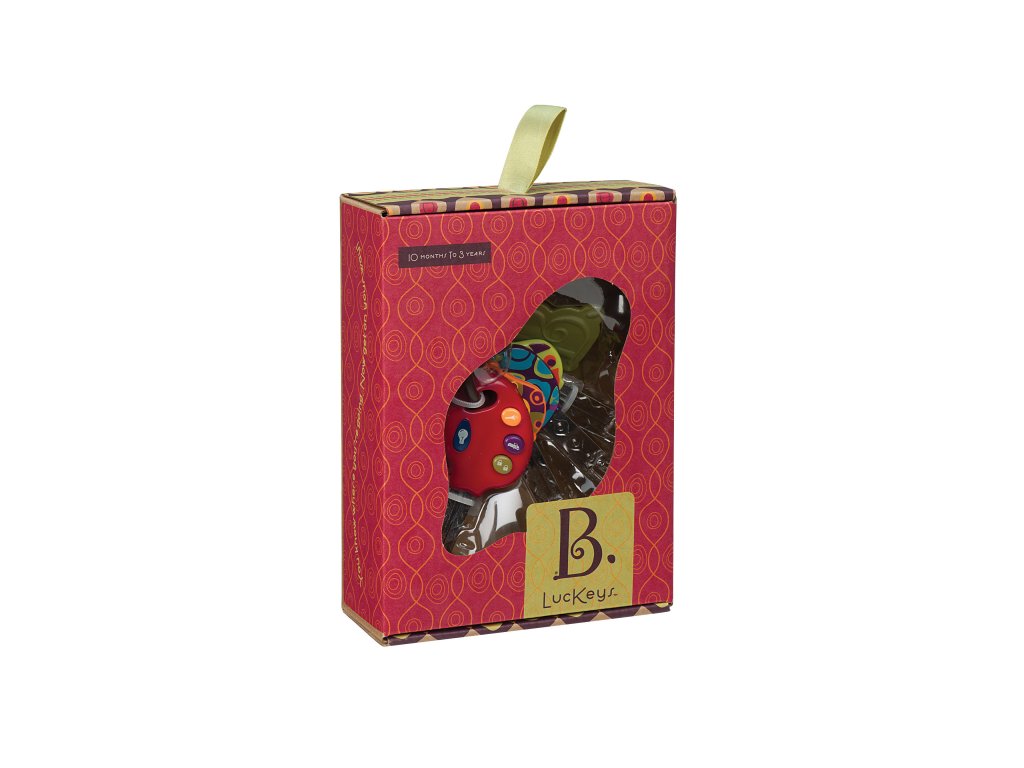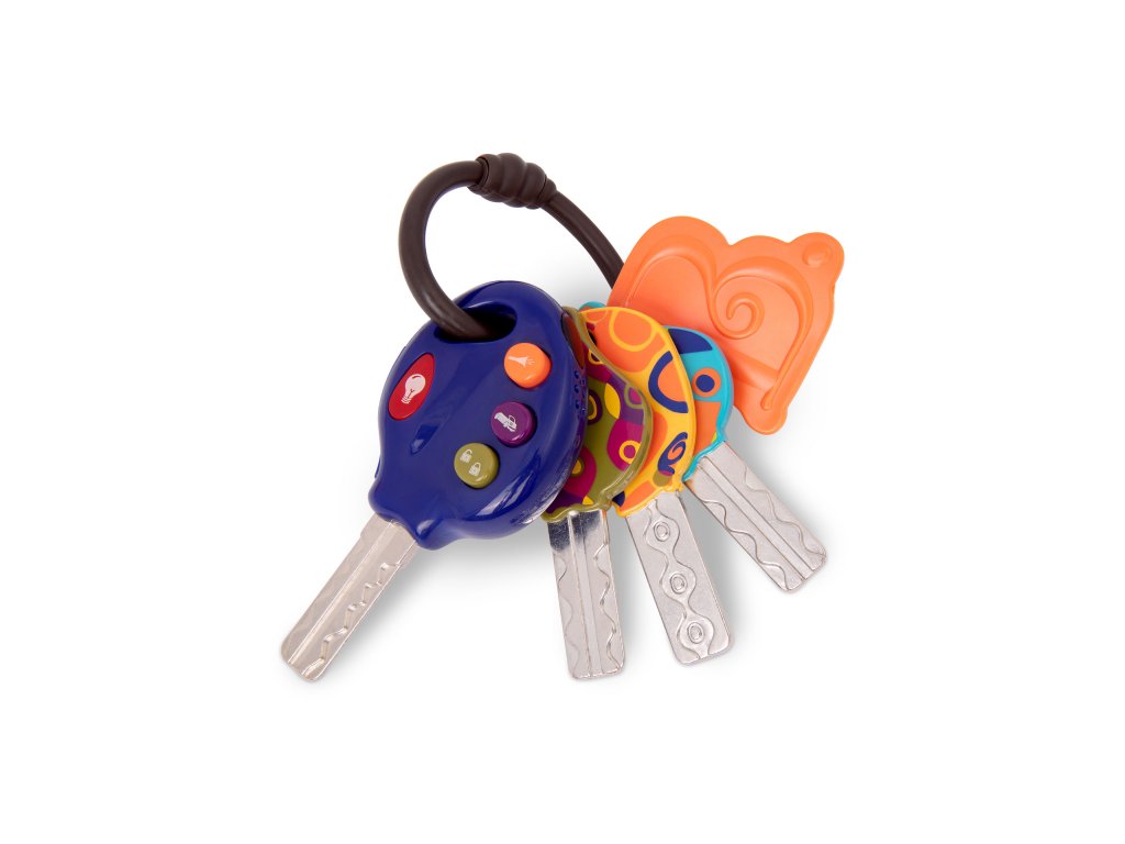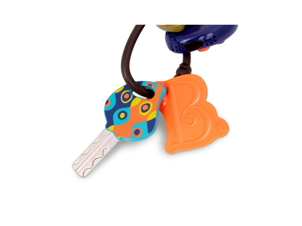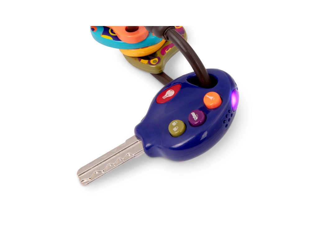 Négy kulcs, mint egy igazi autó kulcsa egy kulcstartón, medállal. Az egyik kulcson van egy távirányító három különböző hanggal és fénnyel. Tartós anyag, biztonságos kézzel és szájjal való felfedezéshez.