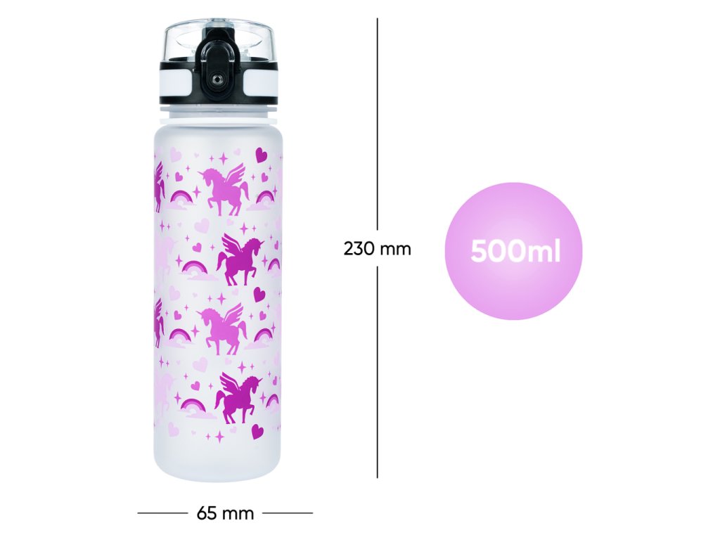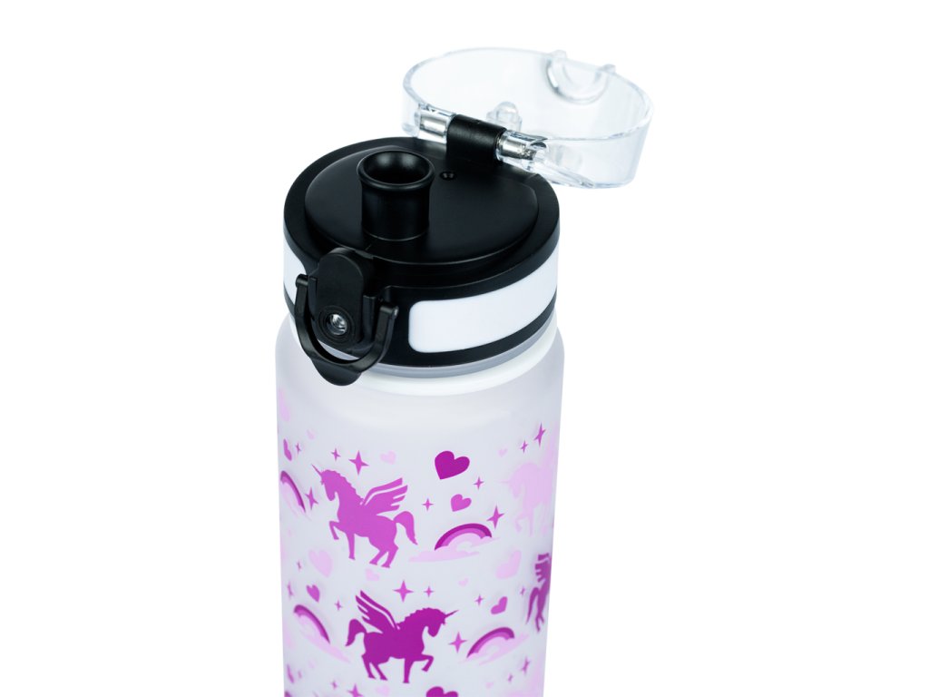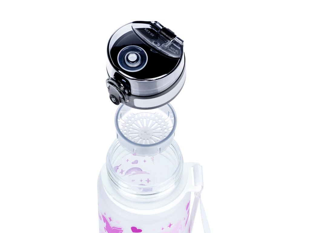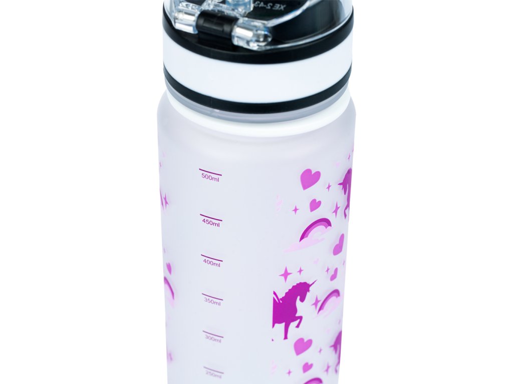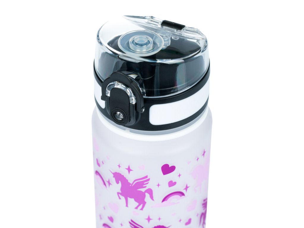 Tritán kulacs gyerekeknek Egyszarvú Királyság 500 ml Egy rendes kulacs nem hiányozhat az iskolai felszerelésből A BAAGL kulacs iskolába, kirándulásra vagy sportkörre is alkalmas. A zárható fedél egyetlen csepp italt sem enged át, és egyszerű, intuitív kezelést biztosít. A kulacshoz tartozik egy szűrő, melynek köszönhetően a kulacs gyümölcsös limonádéhoz vagy teához is használható (az anyag forró italokhoz is alkalmas). A palackhoz egy hurok van rögzítve, amely lehetővé teszi a kényelmes kézben hordozást.A tanúsított tritán anyag garantálja az ital maximális biztonságát és minőségét. Nem bocsát ki kellemetlen műanyag szagot, mint más műanyagok, és nem tartalmaz egészségre káros anyagokat (BPA, PVC, ftalátok stb.). Végül is a tritan termékeket az egészségügyben is használják. A palack használatával csökkenti az egyszer használatos PET palackokból származó műanyag hulladékot, és segít csökkenteni a megtermelt műanyag hulladék mennyiségét, amely eddig főként hulladéklerakókban, égetőkben vagy gyakran a természetben végzi.A kulacs űrtartalma 500 ml.