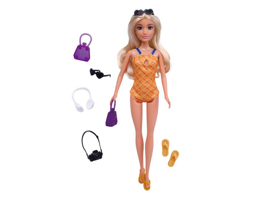 Anlily baba a "Summer holiday" kiegészítőkkel. A baba fürdőruhát visel. Kiegészítők: fényképezőgép, kézitáska, fejhallgató, szemüveg, nyaklánc és papucs. Baba magassága: 30 cm. Csomag méretei: 32 x 18 x 5 cm. Életkor: 3+