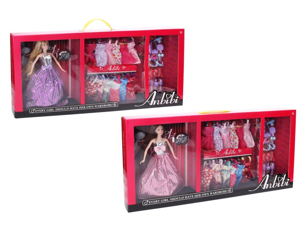 Baba ruhásszekrénnyel. A baba mérete 30 cm. A csomag tartalma - baba, fésű, kefe, ruhásszekrény, cipők, 12 féle ruha, rengeteg divatkiegészítő. Életkor: 3+
