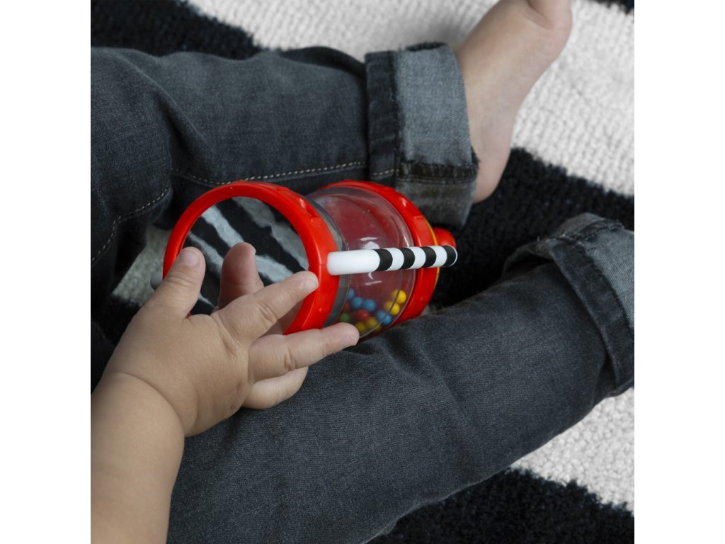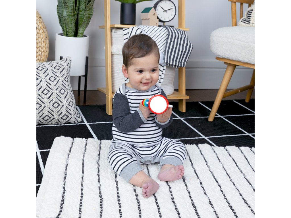 A nagy kontrasztú színek serkentik a baba látásának fejlődését, és a két könnyen megfogható fogantyú teszi ezt az elem nélküli játékot tökéletes módjává a gyermek útközbeni lekötésének.