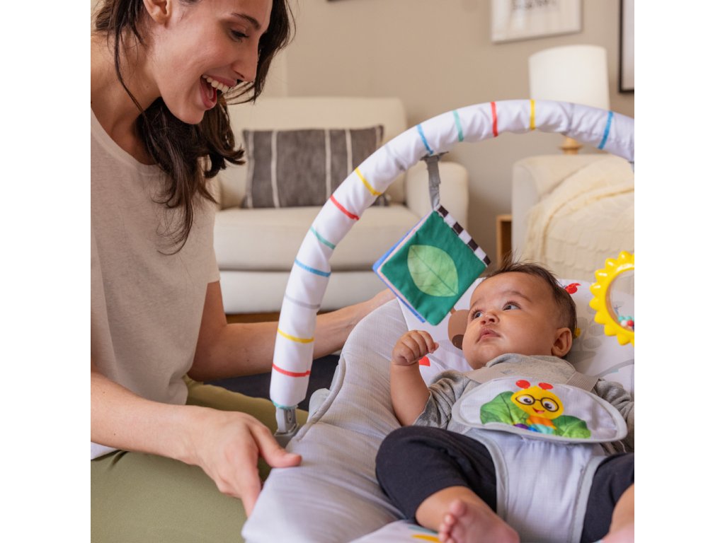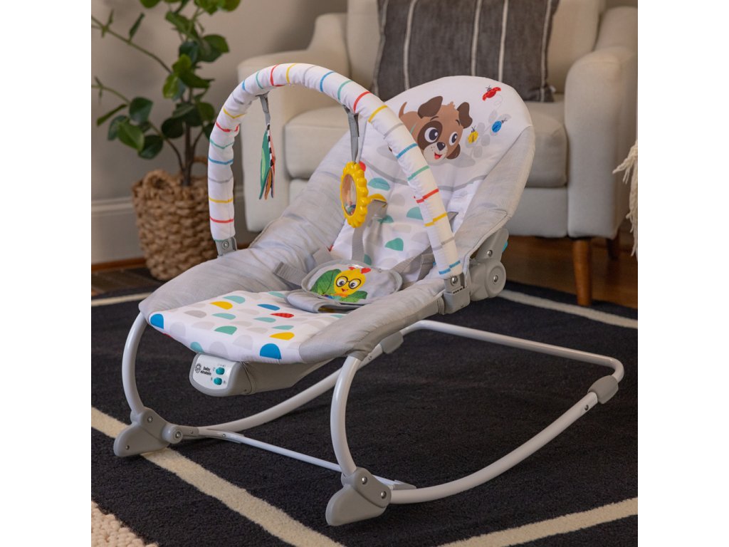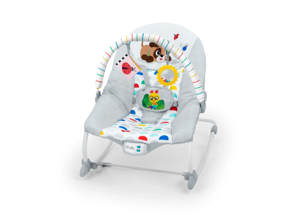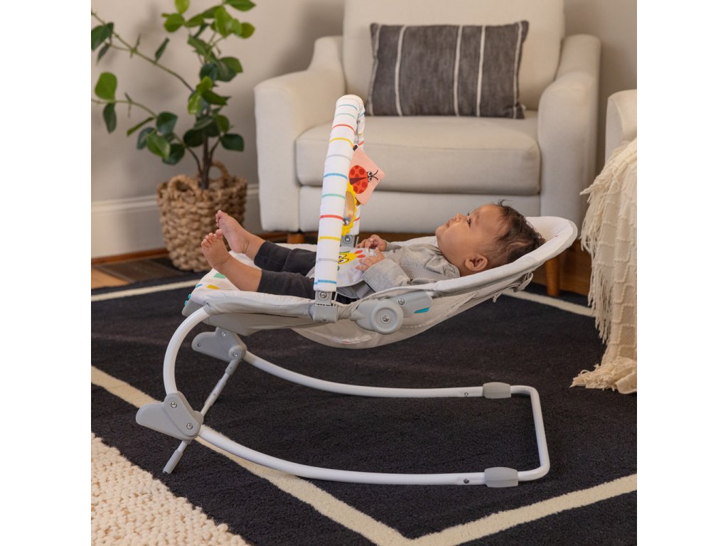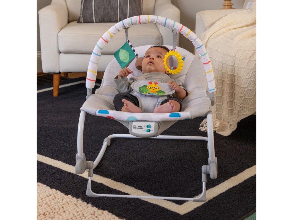 - 2 levehető játék (zörgő könyv és nap alakú csörgő) támogatja az érzékszervi felfedezést; a játékhíd eltávolításával kisgyermek hintájává alakul