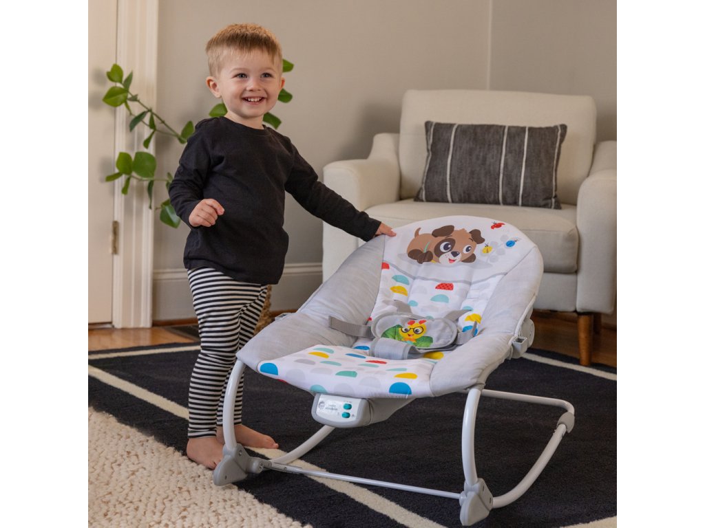 A Dean's Discovery Spot Musical Infant pihenőszék ideális a baba megnyugtatására és szórakoztatására, miközben a szülők pihenhetnek egy kicsit. Az USA-ban tervezték, a pihenőszékek kategóriájában az 1. számú gyártó által. Lehetővé teszi a gyermek számára, hogy pihenjen, zenét hallgasson és felfedezze az érzékeit ülve vagy ringató mozgással. Nyugtassa meg és szórakoztassa a babát több mint 20 percnyi gyengéd vibrációval és dallammal. A pihenőszéket finoman ringathatja, vagy rögzítheti az állványt, és stabil üléssé alakíthatja. A két lógó játékkal ellátott játékhíd támogatja a nyújtást és a felfedezést: nap alakú csörgő és susogó könyv. Ahogy a gyermek növekszik, eltávolíthatja a játékhidat és kikapcsolhatja az állványt, így az ülés kisgyermekkori hintává alakul!