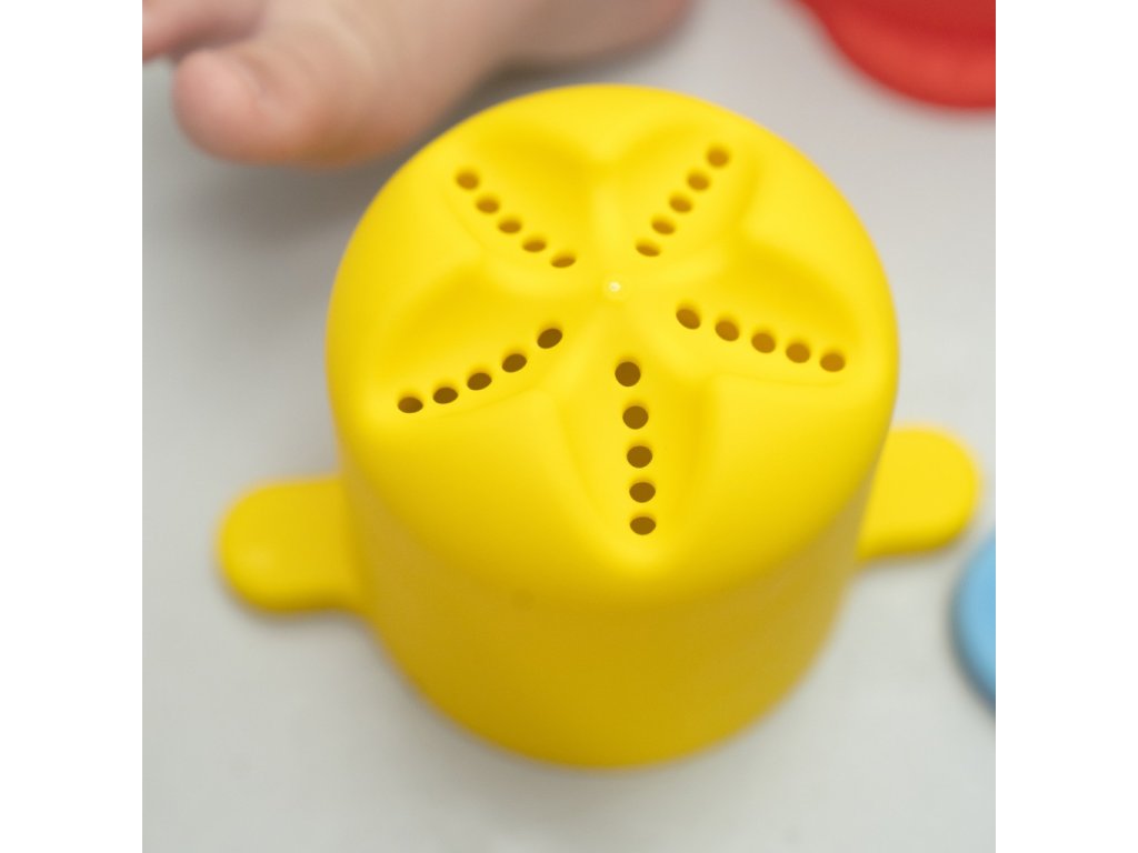 - Multiszenzoros játék 4 nagy, egymásba rakható pohárral és kagyló alakú vízpermetezővel, amelyek segítik a gyermeket az építésben, öntésben és a színek, textúrák és egyebek felfedezésében.