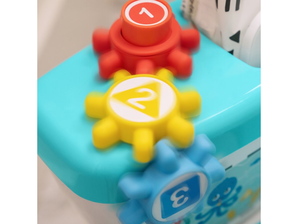 - Öblítőgomb színes, forgó fogaskerekekkel, amelyek öblítési hangokat és játékos zenét adnak ki; Minden megnyomásra a gyermek megtanulja az okot és az okozatot, és fejleszti a finommotorikát.
