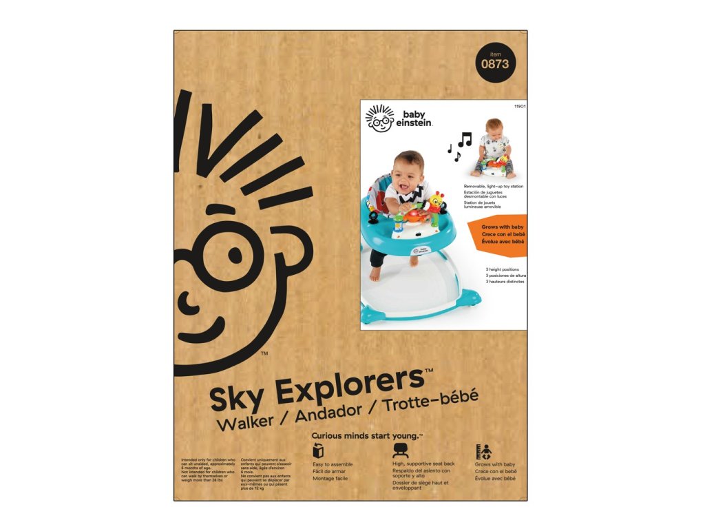 A járás még sosem volt ilyen szórakoztató. A Sky Explorers Walker járóka tökéletes a gyermekek számára, és örömüket lelik az első lépésekben és a mozgásban. A járóka egyedi elliptikus kialakítással rendelkezik a könnyebb mozgás érdekében. A levehető fény- és zenepanel kormánnyal és interaktív játékokkal a járókán kívül is használható játékra. A magas ülőrész biztosítja a gyermek számára a szükséges kényelmet és támogatást ülés közben. A járóka vázának három magassági pozícióba állításának lehetősége biztosítja gyermeke megfelelő fejlődését, mivel a lábfejeket megfelelő helyzetben tartja