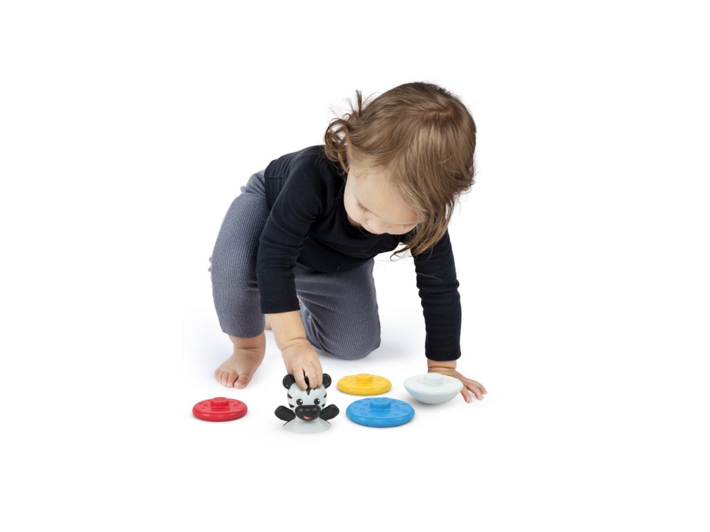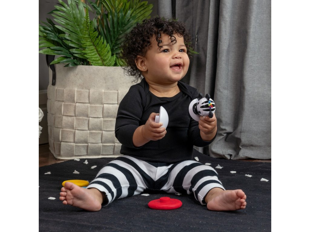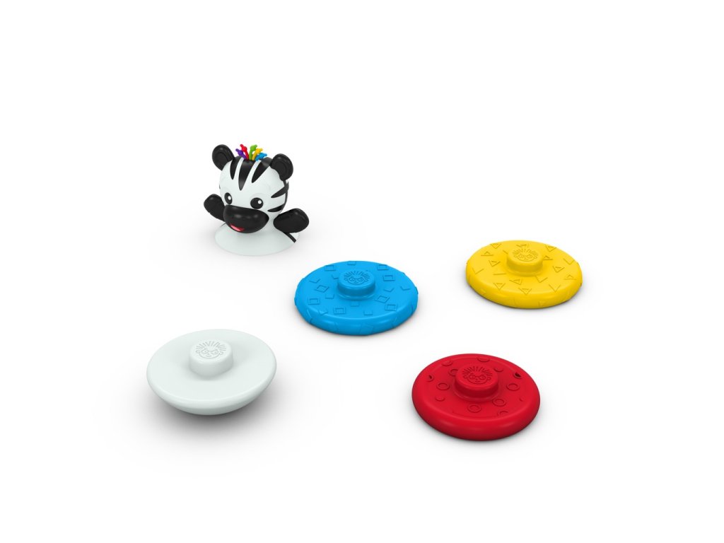 Ez a színes, nyikorgó játék segít támogatni a gyermek tanulását az okokról és következményekről. Az élénk színű, BPA-mentes karikák textúrája megnyugtatja a fájó ínyt, és segít a baba első érzékszervi készségeinek fejlesztésében. A Baby Einstein műsorokból és könyvekből ismert Zen zebra motívumával a kisebb babák imádni fogják a tárolóba való ütögetést, hogy Zen ringatózzon, ami elősegíti az ok-okozati összefüggések tanulását. A 4 levehető korong segítségével a nagyobb babákat megtaníthatja az alapszínekre, a számolásra és az egymásra rakásra.