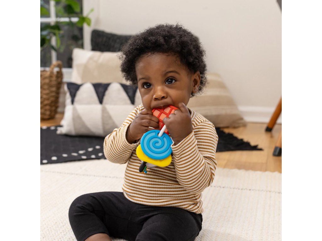 A Zen rázásakor a baba csörgő hangokat fog hallani, így felfedezheti Zen texturált füleit, érezheti a színes szenzoros zsinórokat, és mosolyoghat, amikor meglátja a tükörképét a hátoldalon lévő tükörben. A három szilikon forma segít megnyugtatni a fájó ínyt, és a szülők felhasználhatják a színek és formák tanítására. Úgy tervezték, hogy a baba könnyen meg tudja fogni.