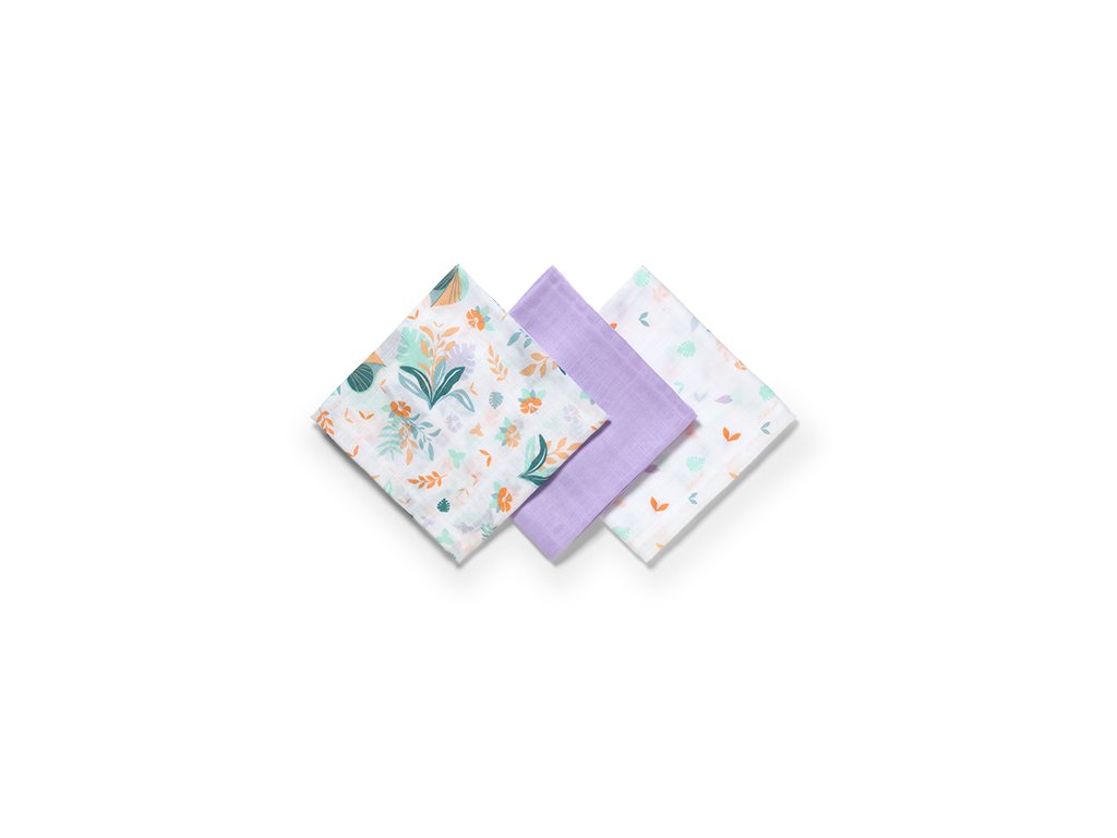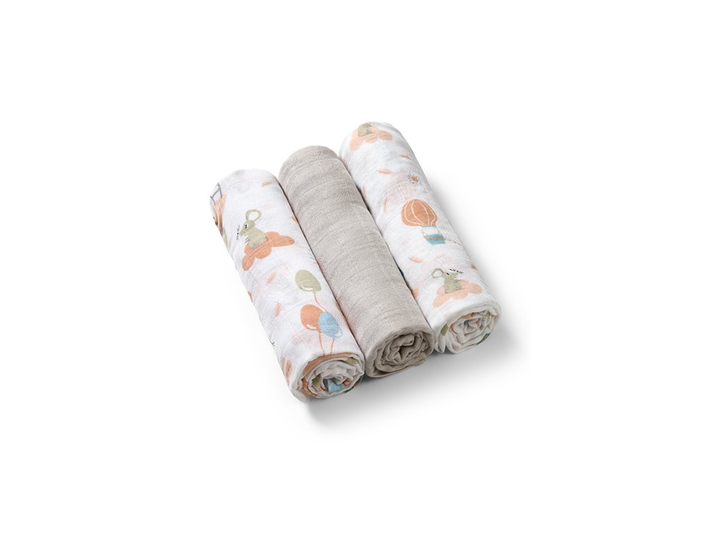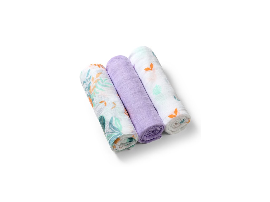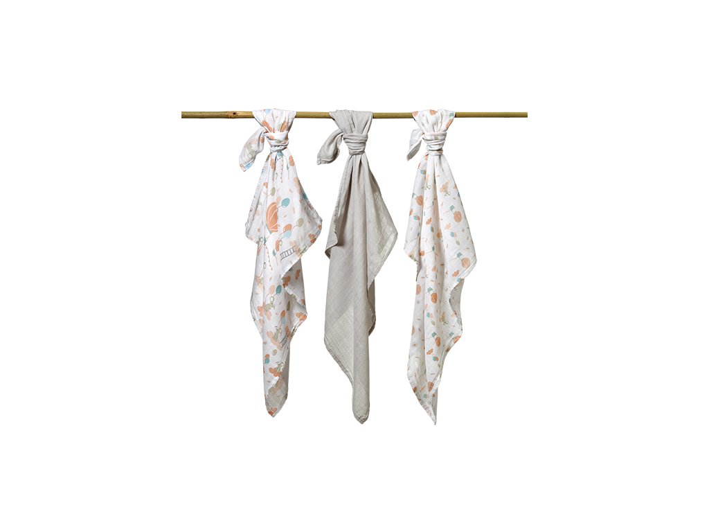 A készlet 3 pelenkát tartalmaz: 2 közülük színes nyomatokkal díszített, egy pedig egyszínű.