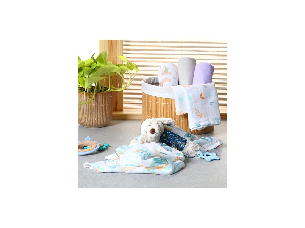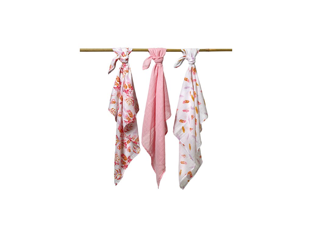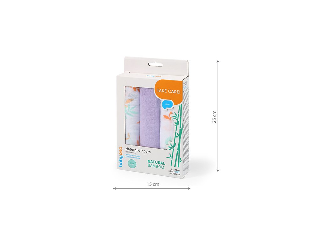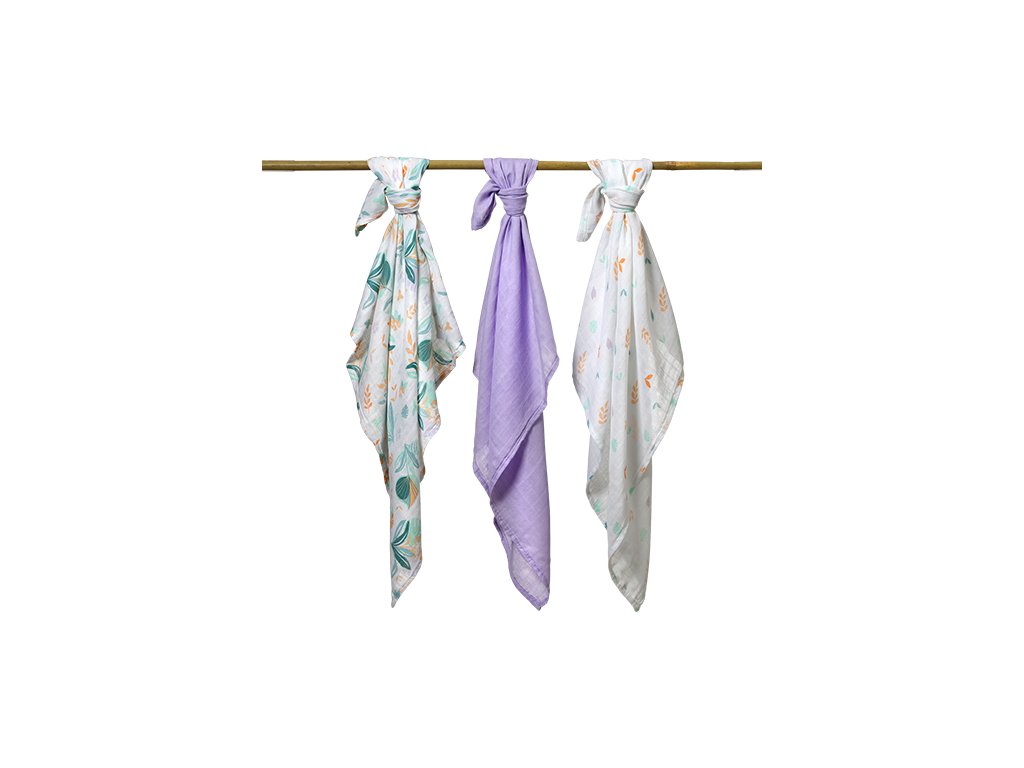 A készlet 3 pelenkát tartalmaz: 2 közülük színes nyomatokkal díszített, egy pedig egyszínű.