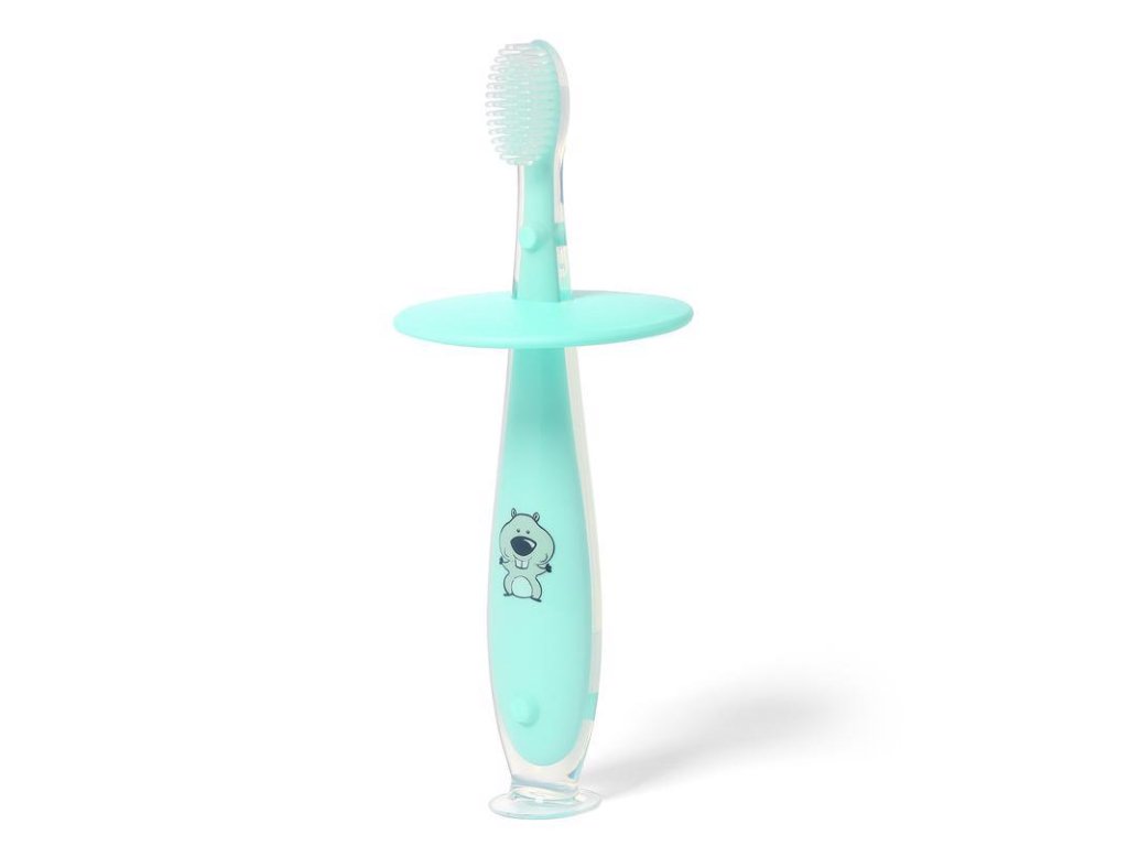 Finom szilikon fogkefe ütközővel, amely megakadályozza, hogy a gyermek túl mélyen helyezze a szájába.