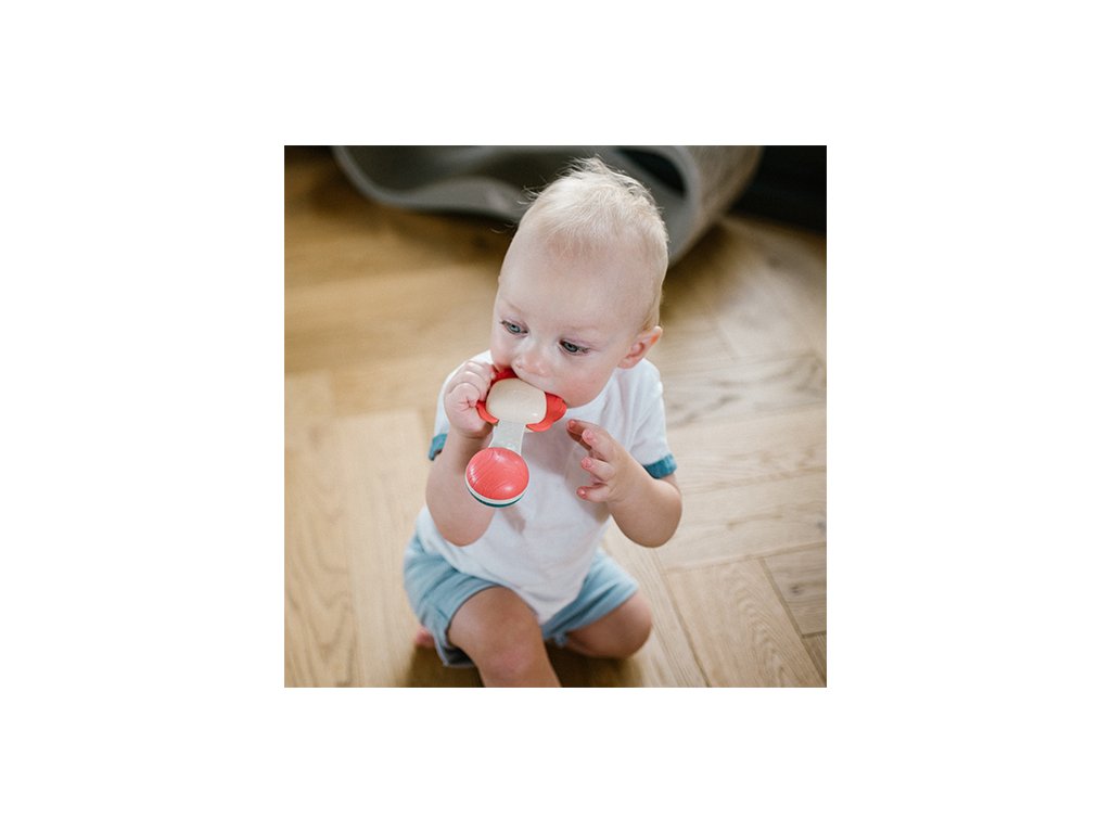 - Rázáskor a csörgő finom hangokat ad ki, amelyek felkeltik a baba figyelmét és fejlesztik a hallását.