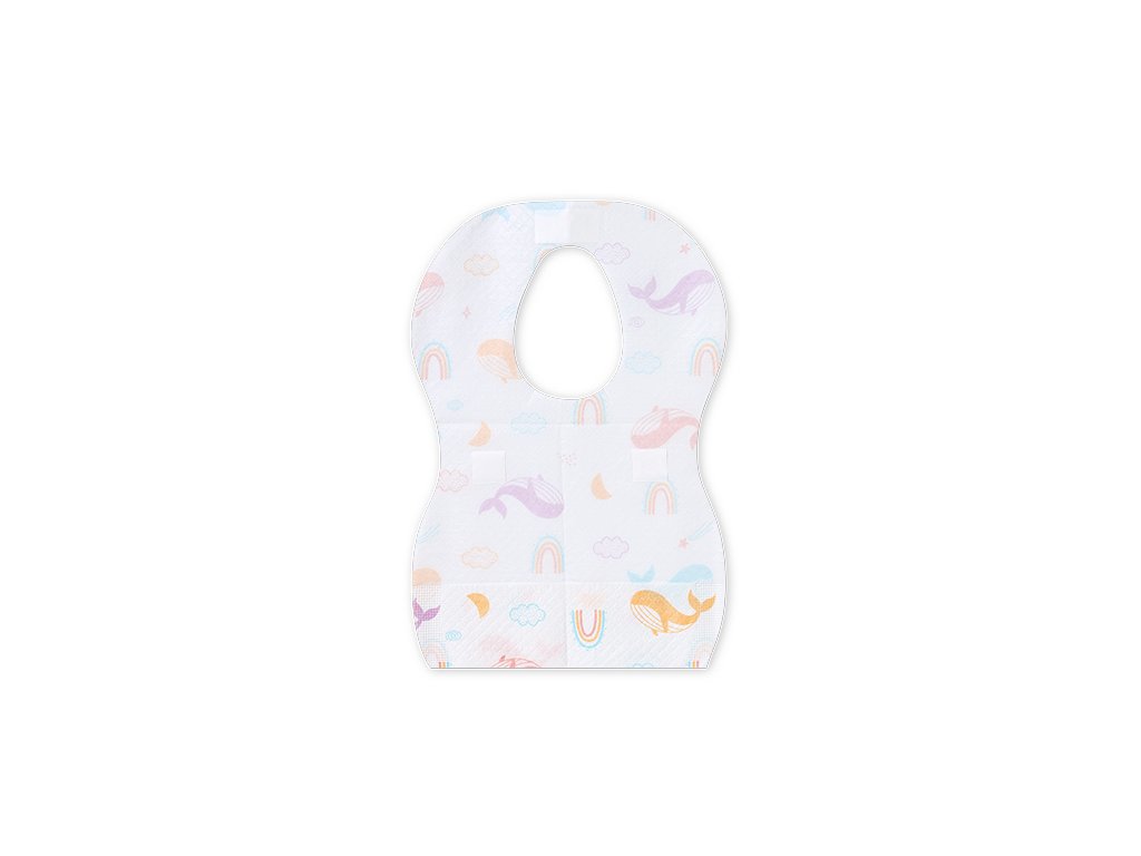 Tépje le a perforációt, hajtsa ki a zsebet, gombolja hátul, és kész – babája védve van a szennyeződésektől és készen áll az étkezésre.