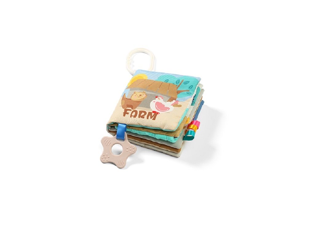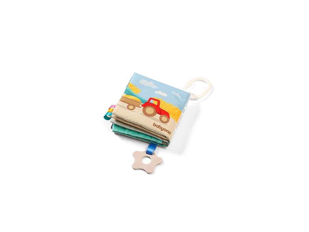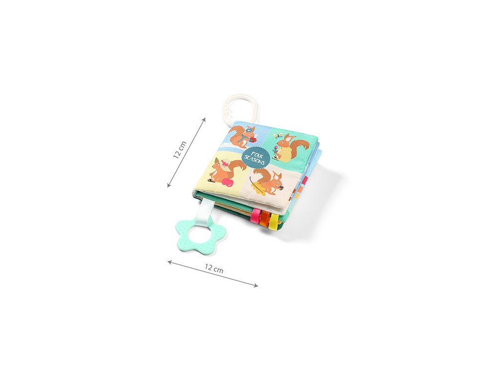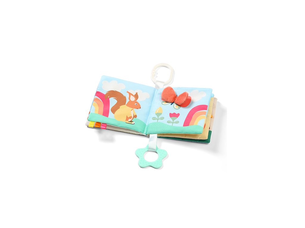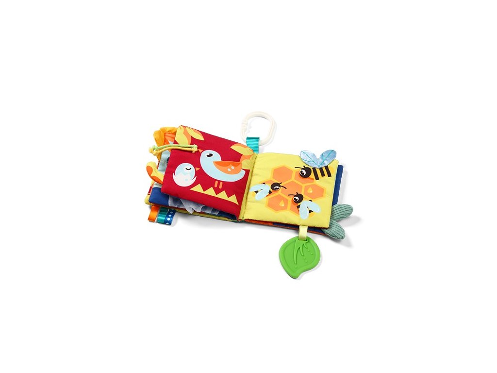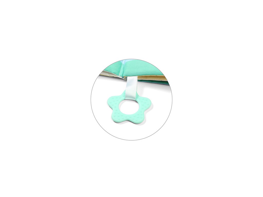 A könyvhöz biztonságos rágóka van rögzítve. A baba masszírozhatja vele a fájó ínyét.