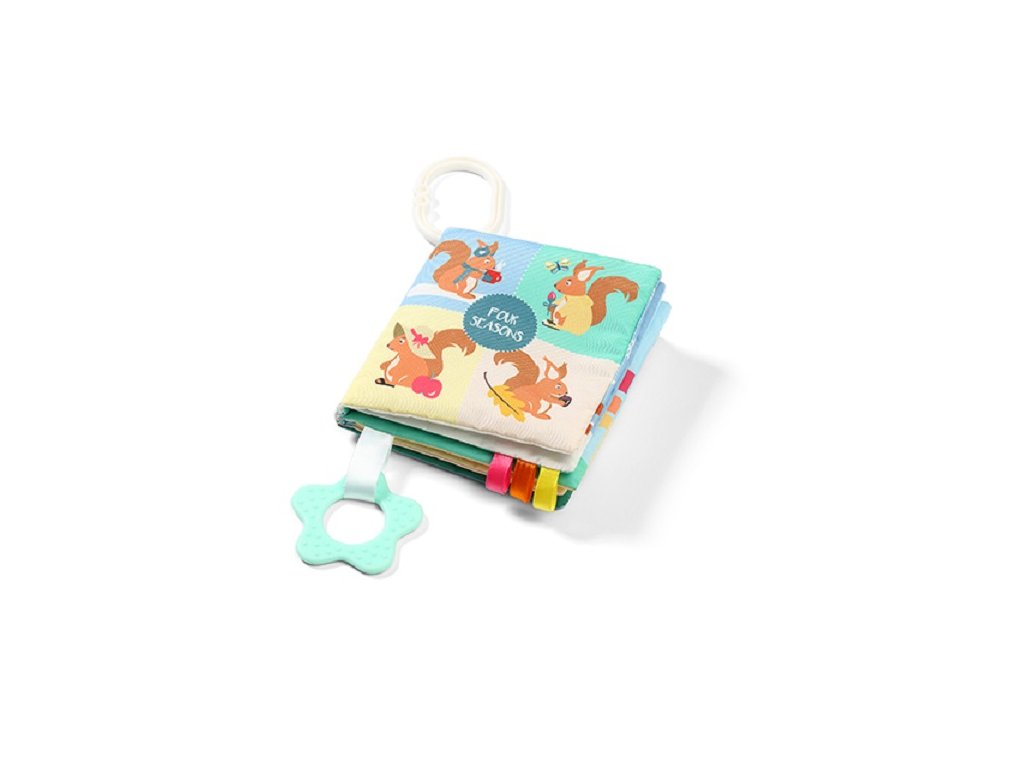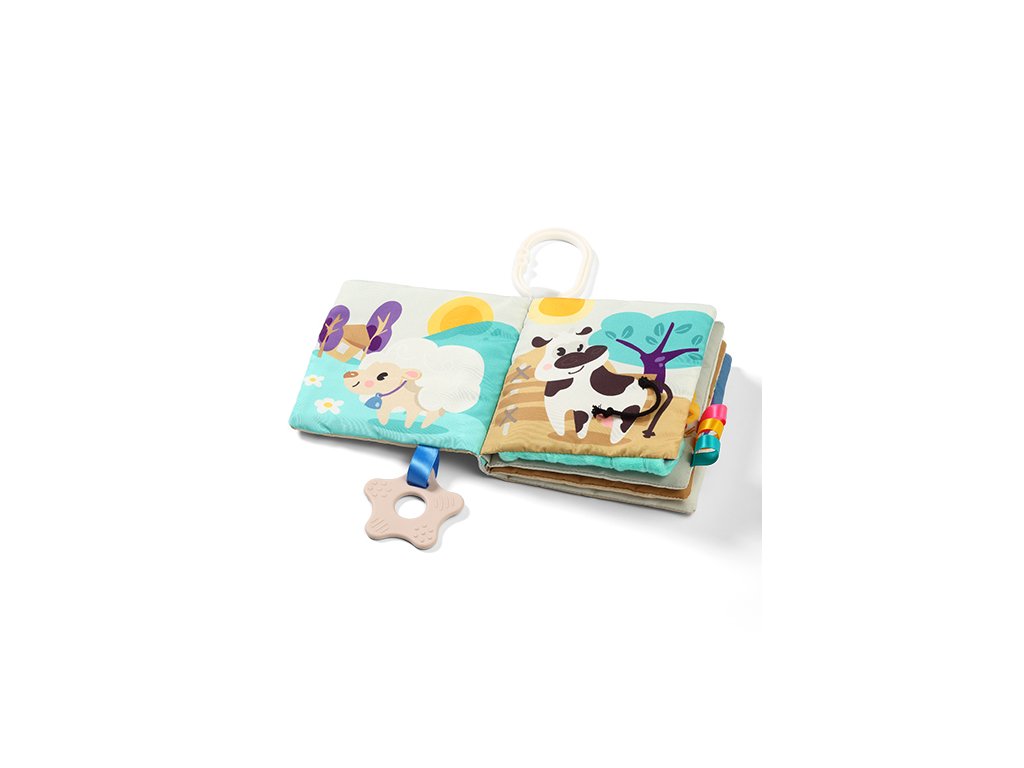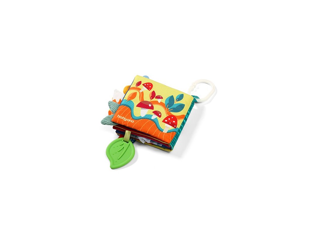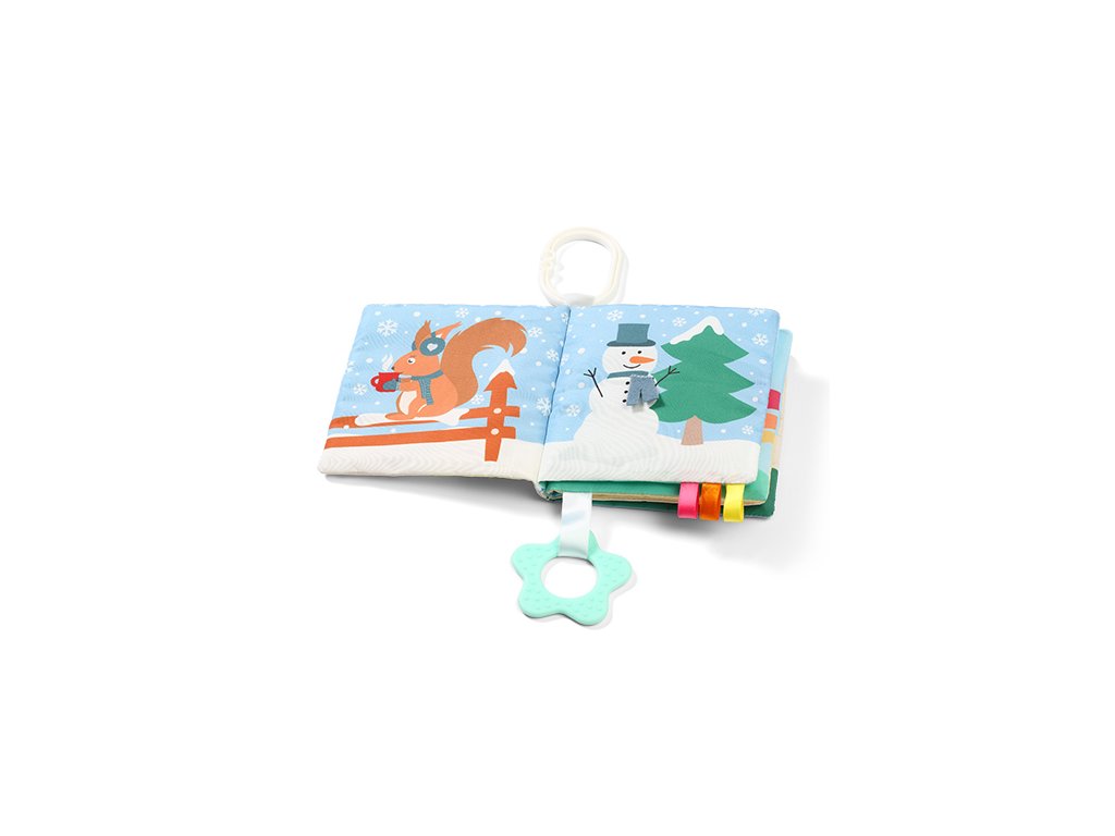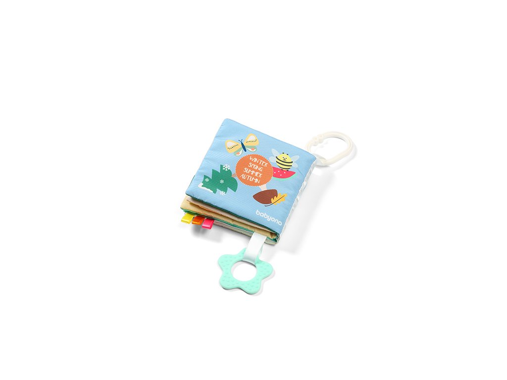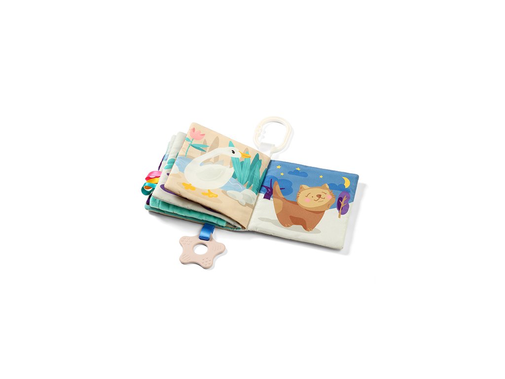 A könyvhöz biztonságos rágóka van rögzítve. A baba masszírozhatja vele a fájó ínyét.