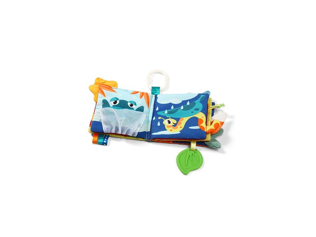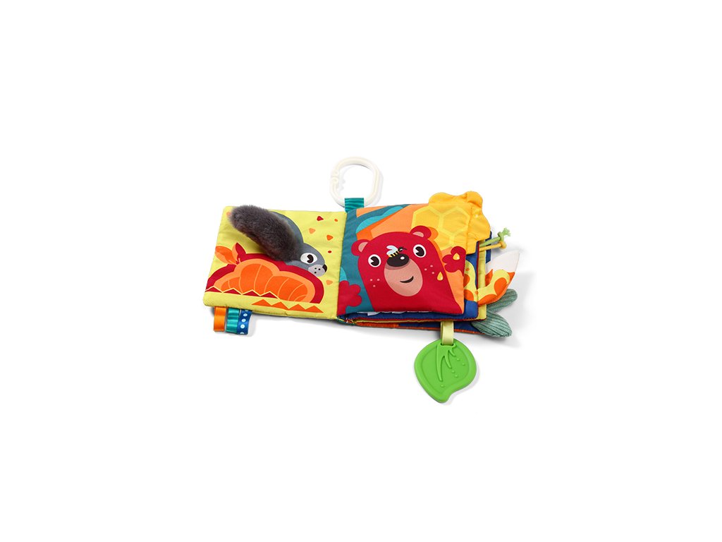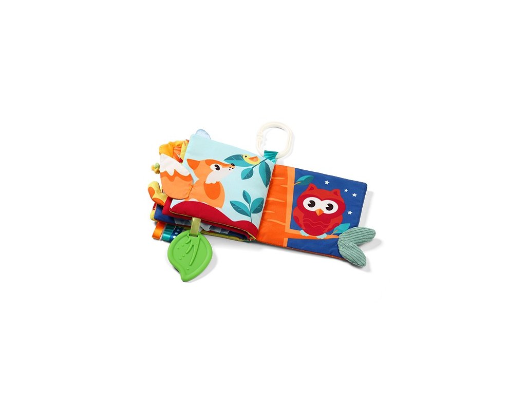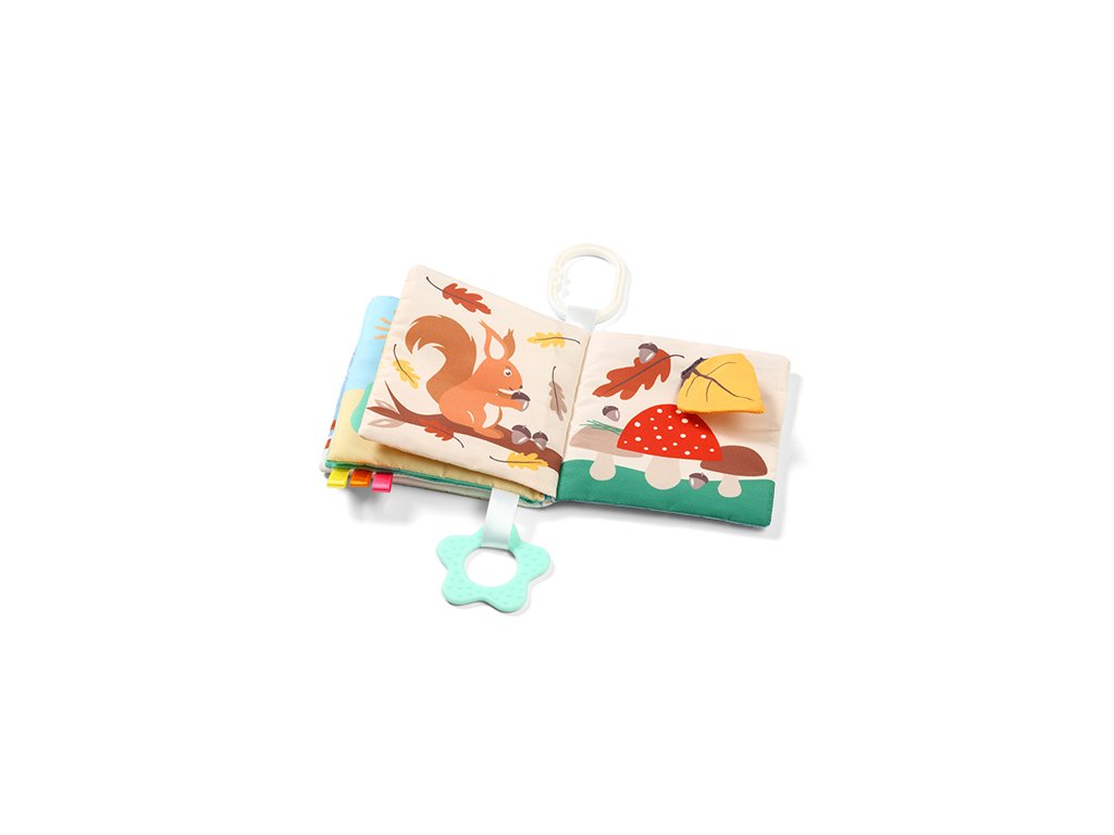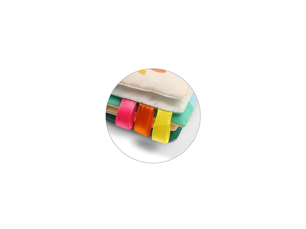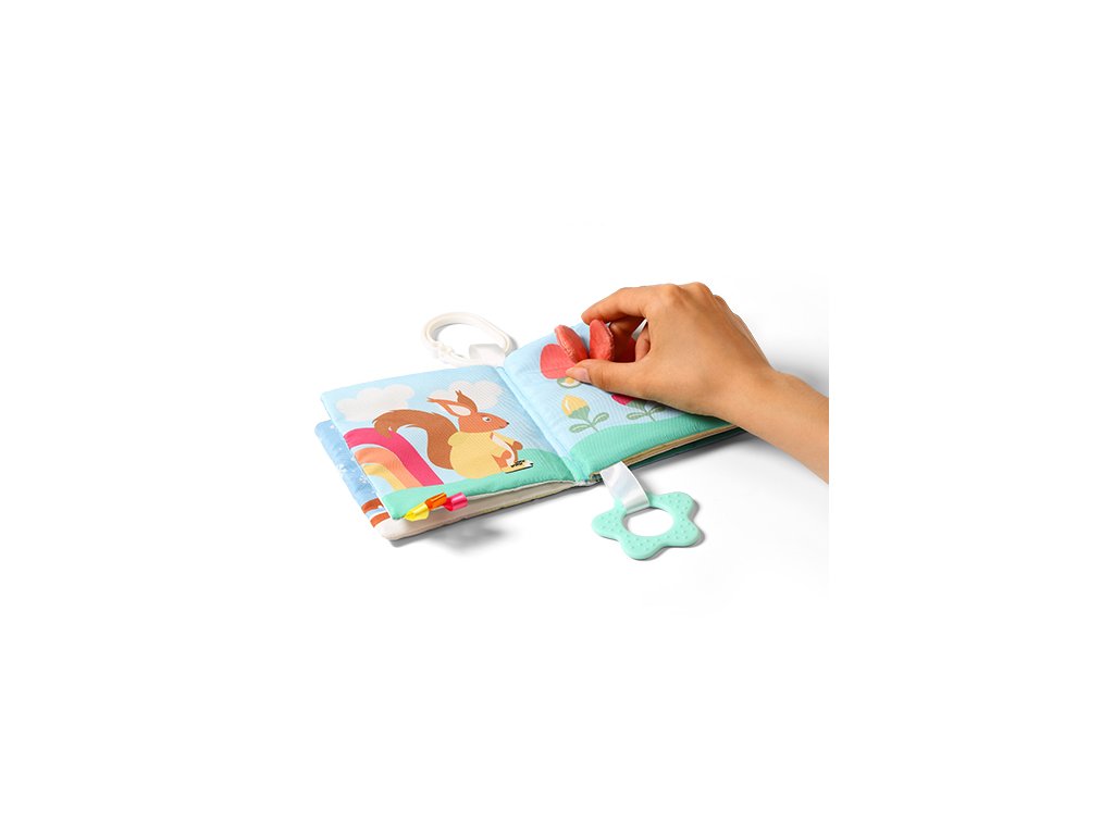 A könyv különböző textúrájú és színű anyagokból készült. Nélkülözhetetlen gyermeke érzékeinek fejlődéséhez. A játék emellett támogatja a látási, hallási és motoros koordinációt.