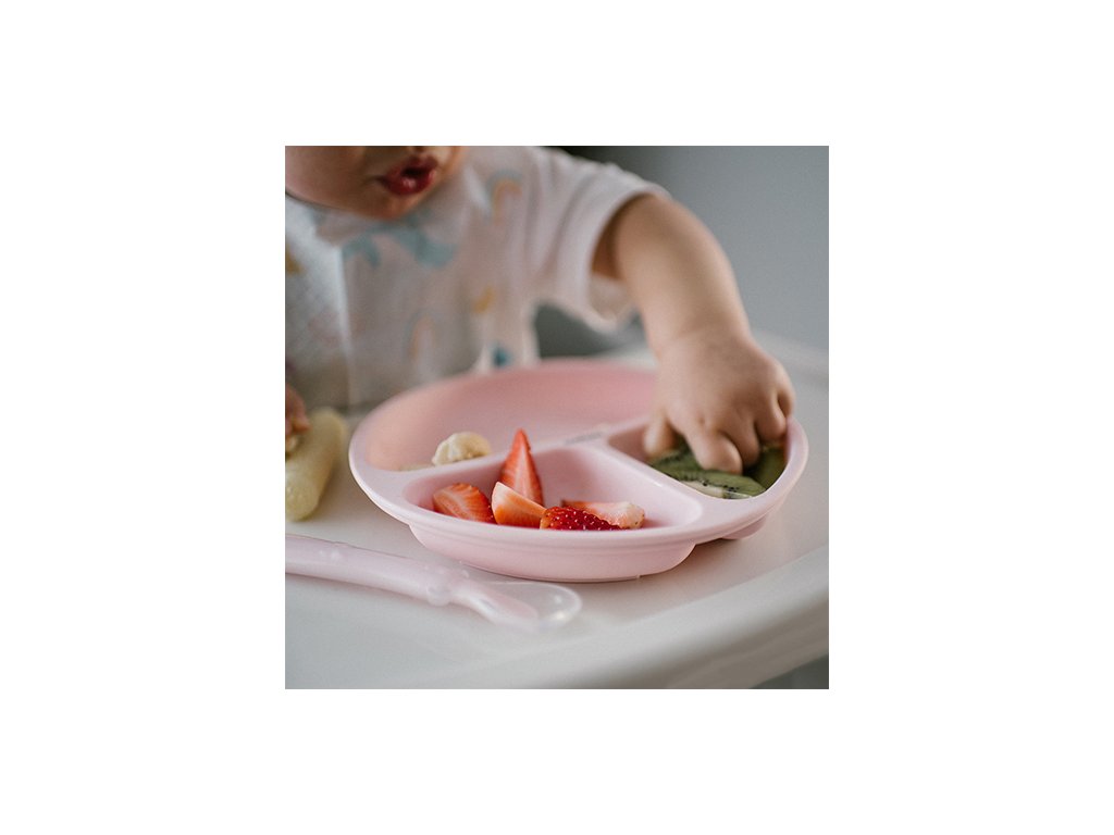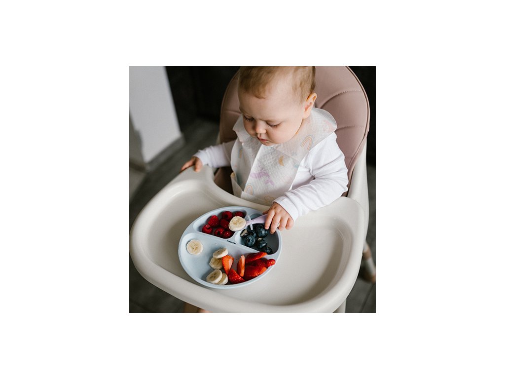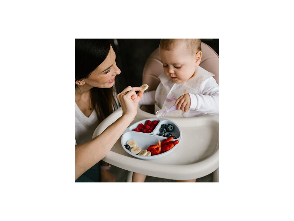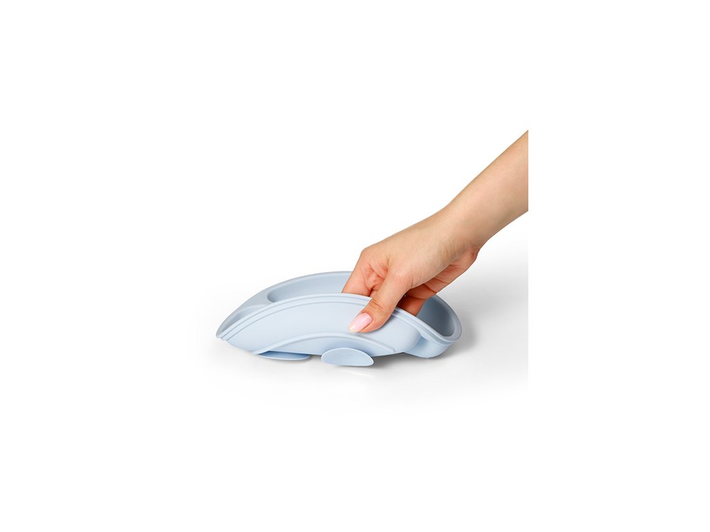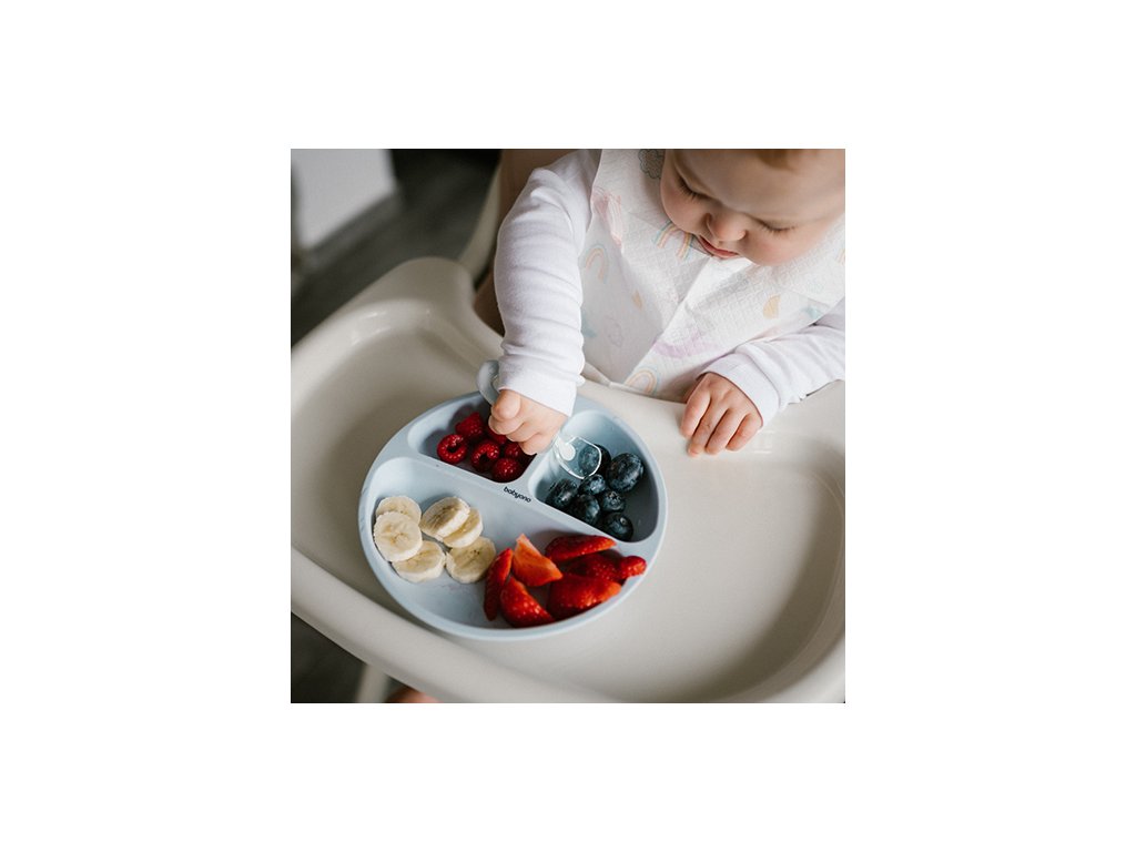 Az alsó részén található tapadókorongnak köszönhetően kicsi a tányér kiömlésének vagy leesésének kockázata. A tányér ergonomikus formája megkönnyíti a gyermekek számára az étel elfogadását és az első lépéseket az étkezésben. A három praktikus rekesz arra ösztönzi a gyermeket, hogy új ételeket és ízeket próbáljon ki. A tányér kiváló minőségű szilikonból készült, egészségre ártalmatlan és könnyen tisztítható. Mosogatógépben mosható és mikrohullámú sütőben előmelegíthető.