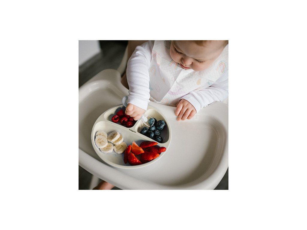 Az alsó részén található tapadókorongnak köszönhetően kicsi a tányér kiömlésének vagy leesésének kockázata. A tányér ergonomikus formája megkönnyíti a gyermekek számára az étel elfogadását és az első lépéseket az étkezésben. A három praktikus rekesz arra ösztönzi a gyermeket, hogy új ételeket és ízeket próbáljon ki. A tányér kiváló minőségű szilikonból készült, egészségre ártalmatlan és könnyen tisztítható. Mosogatógépben mosható és mikrohullámú sütőben előmelegíthető.