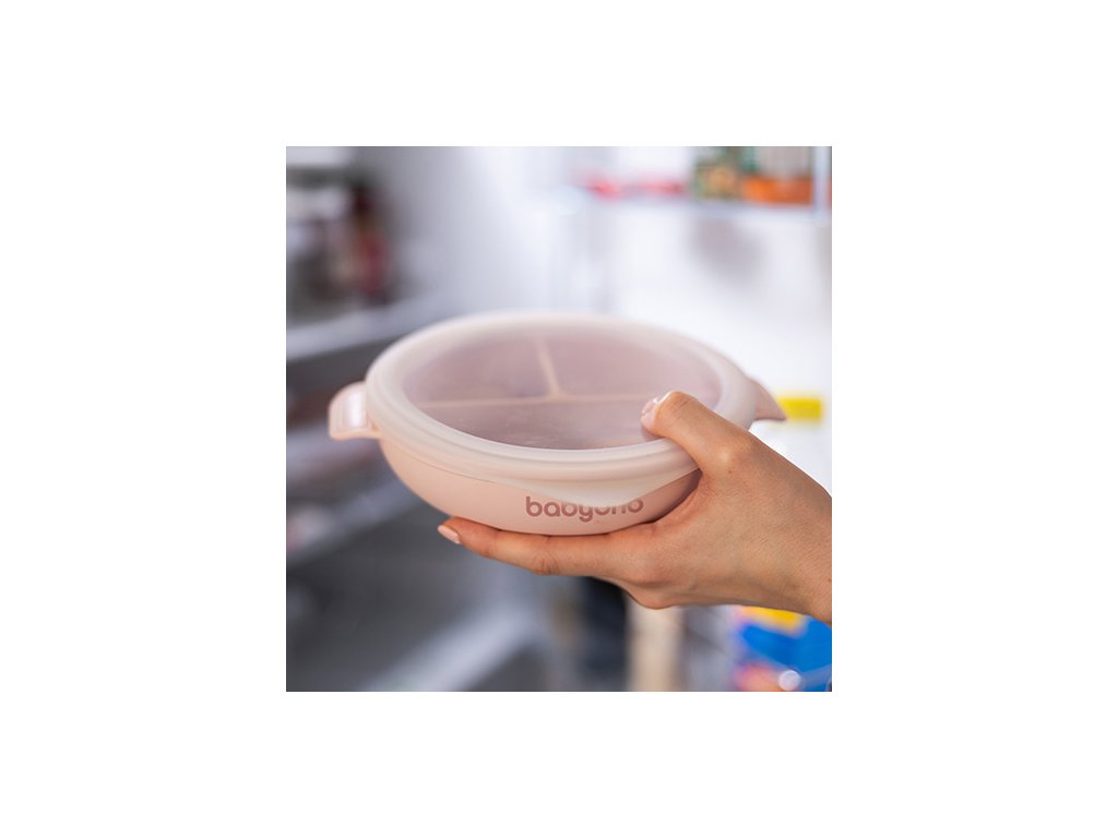 BABYONO Szilikon tányér tapadókoronggal és fedővel rózsaszín 6h+