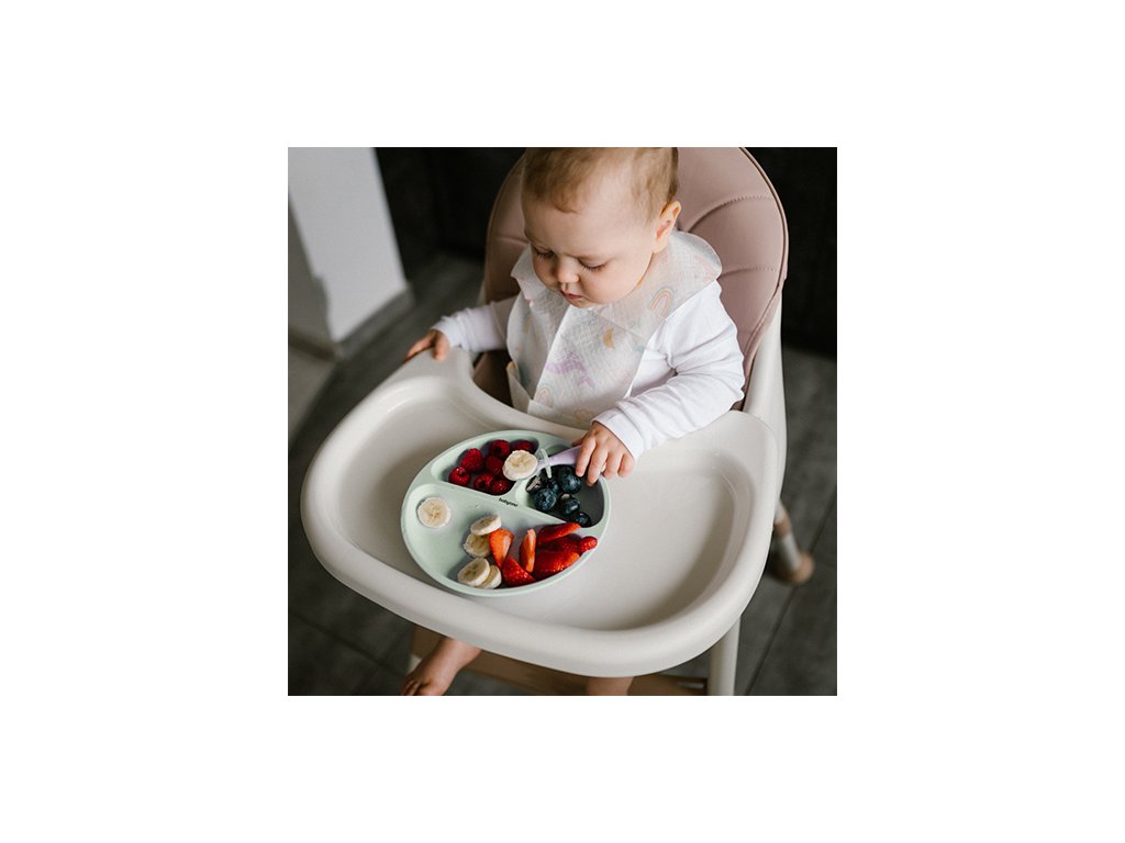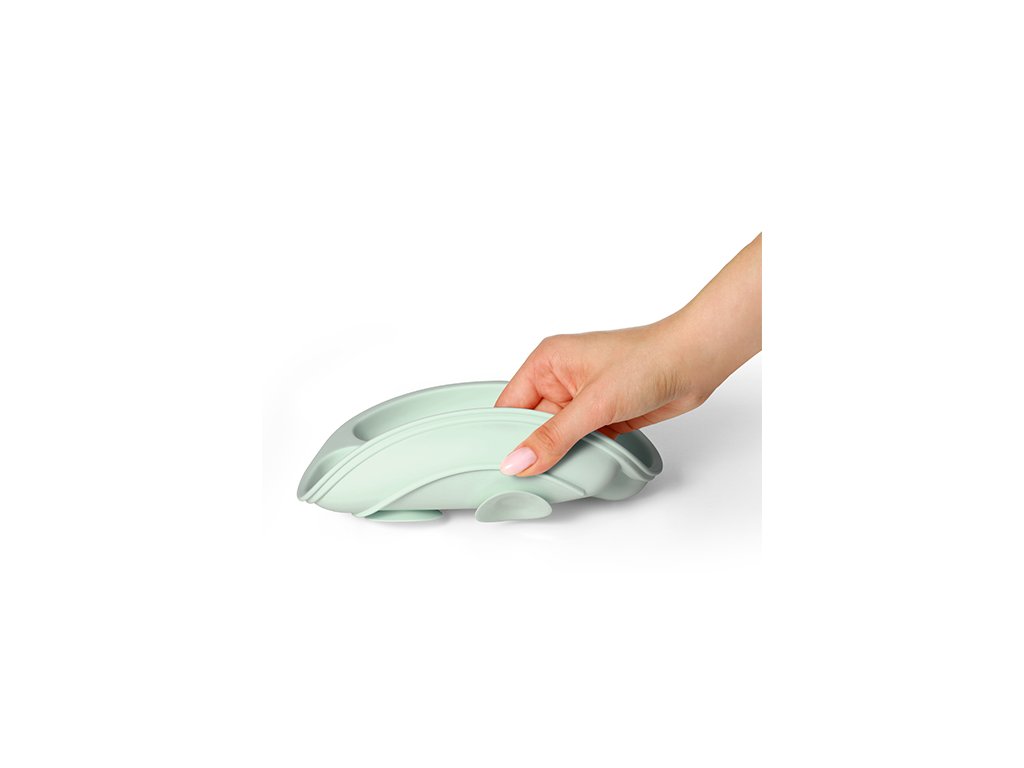 Az alsó részén található tapadókorongnak köszönhetően kicsi a tányér kiömlésének vagy leesésének kockázata. A tányér ergonomikus formája megkönnyíti a gyermekek számára az étel elfogadását és az első lépéseket az étkezésben. A három praktikus rekesz arra ösztönzi a gyermeket, hogy új ételeket és ízeket próbáljon ki. A tányér kiváló minőségű szilikonból készült, egészségre ártalmatlan és könnyen tisztítható. Mosogatógépben mosható és mikrohullámú sütőben előmelegíthető.
