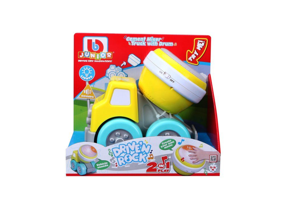 Betonkeverő dobbal 2 az 1-ben a Drive'N Rock sorozatból. Színes autó levehető dobbal. A dob kétféle játékmóddal rendelkezik, előre beállított dallamokkal vagy szabad játék változatban. Ezzel az autóval Rock 'N Roll-t hozhatsz gyermekeid szobájába, és megtaníthatod őket nemcsak zenélni, hanem fejleszteni is a szem-kéz koordinációjukat. Az autó 12 hónapos kortól alkalmas gyermekek számára. Az autó működéséhez két AAA elem szükséges, amelyeket a csomag tartalmazza. Az autó mérete 7,9" (20,06 cm) Csomag mérete: 21,6 x 24,8 x 14,6 cm.