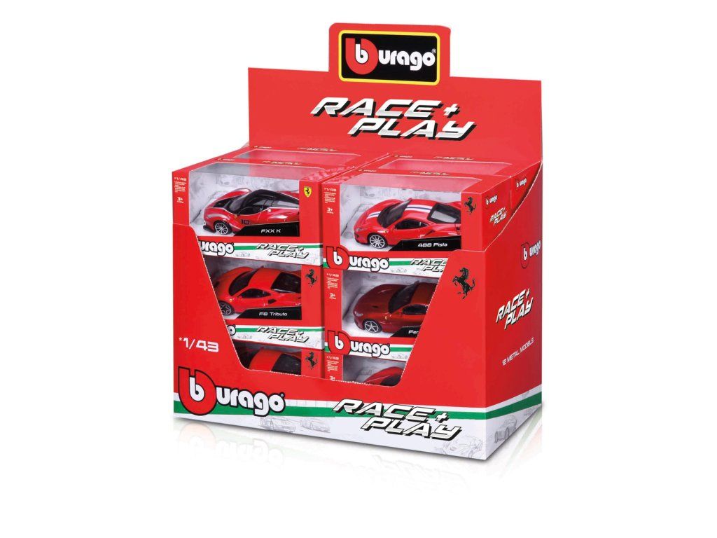Bburago - Race+Play autók, Ferrari, display 12 db, 1:43, assort