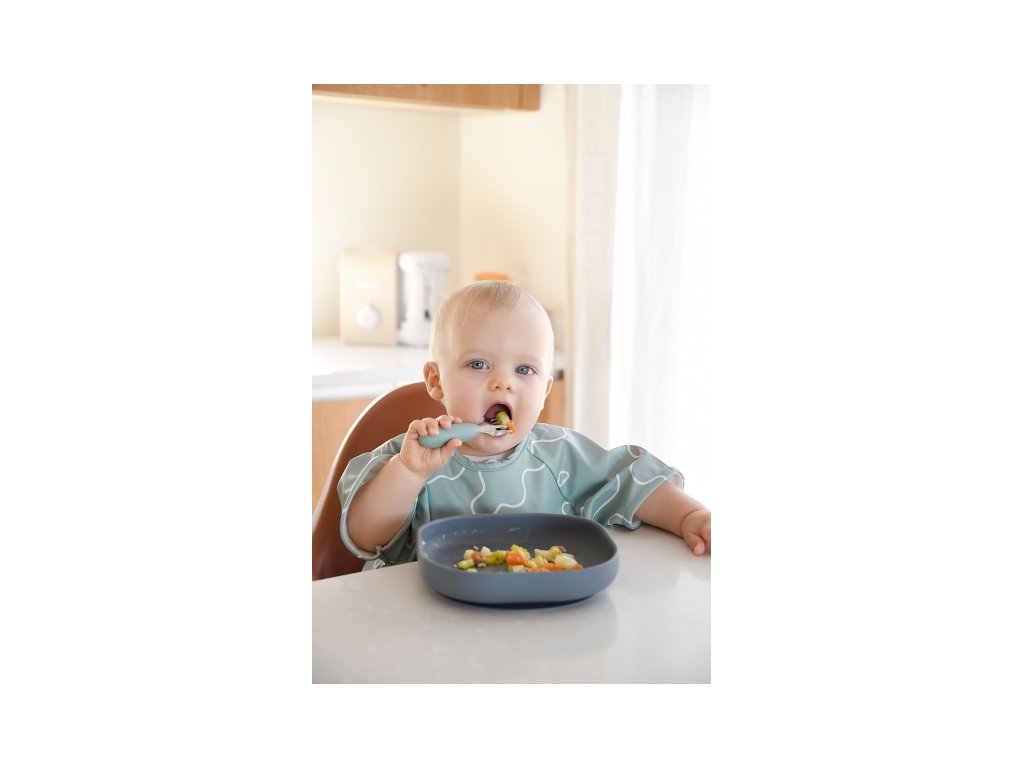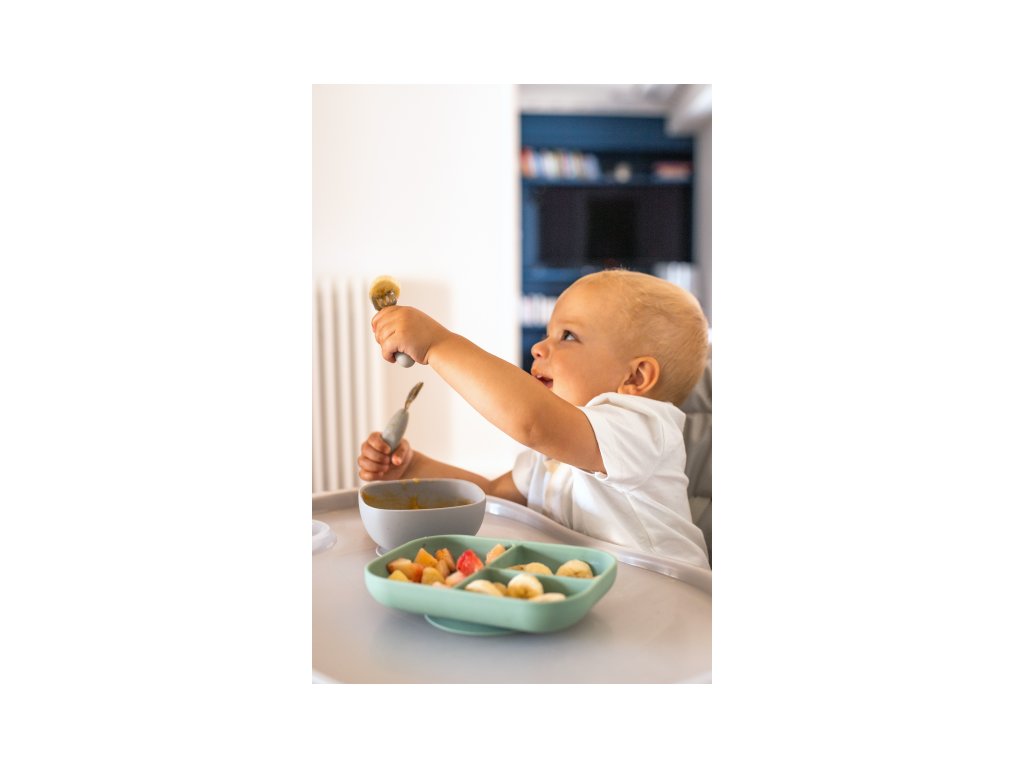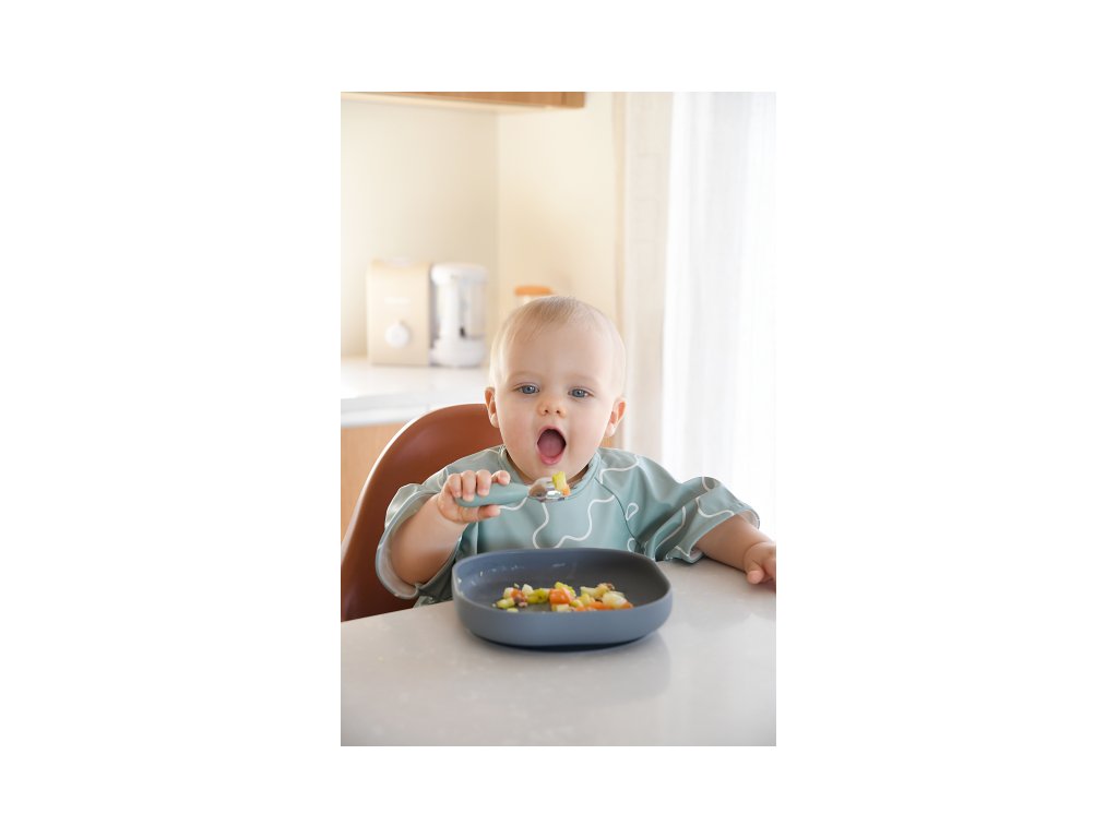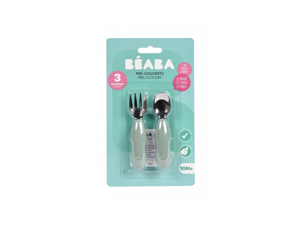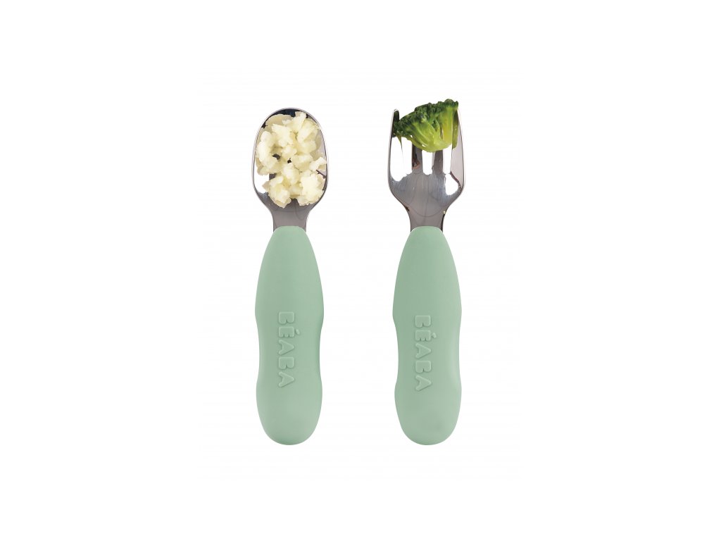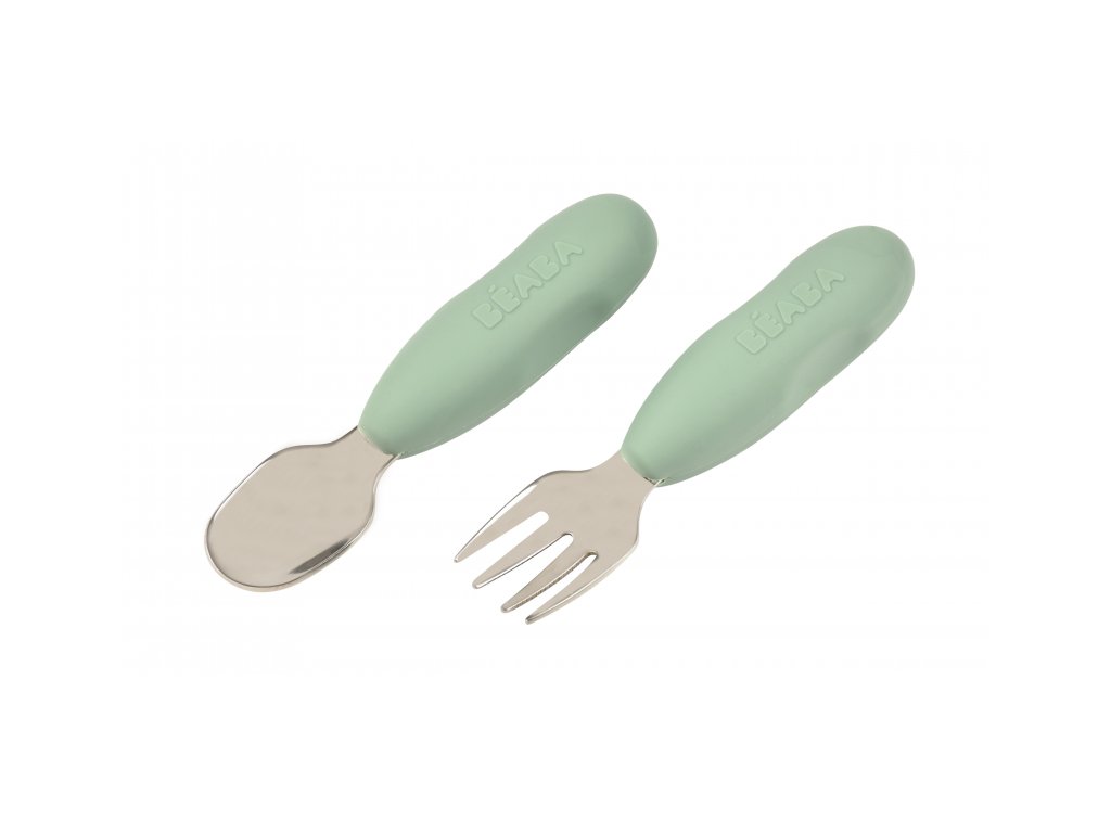 Az első, minőségi rozsdamentes acélból készült, műanyag nyelű evőeszköz megkönnyíti a gyermek számára az átállást a kanállal való etetésről az evőeszköz használatára. A rozsdamentes acél villa és kanál könnyű, és az ergonomikus műanyag nyélnek köszönhetően a gyermekek könnyen megfoghatják. A sekély kanál ideális kis mennyiségű táplálék felvételére, amelyet a gyermek a szájába tud vinni. A villa lekerekített hegyei garantálják a biztonságos használatot.