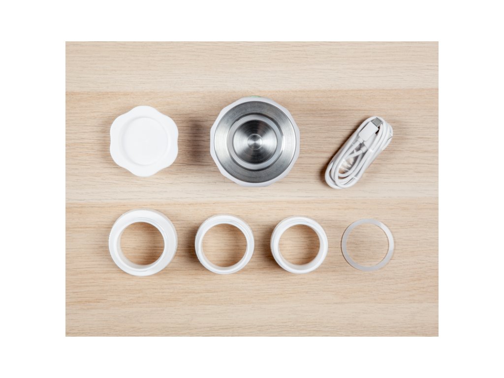 A csomag tartalmaz egy védőfedelet, USB-C töltőkábelt, tartalék szilikon tömítést, 50 mm-es palackadaptert (NUK), 60 mm-es palackadaptert (Tommee Tippee), 53 mm-es palackadaptert (MAM).