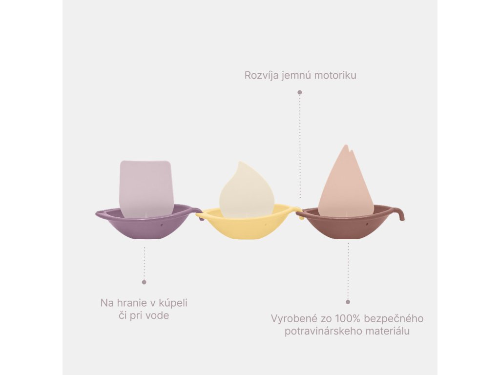 A BIBS egy népszerű dán márka, amely 1978 óta gyárt ikonikus cumikat. A cumikon kívül a BIBS a legkisebb gyermekek számára is kínál változatos, prémium termékeket minimalista skandináv dizájnban és széles színválasztékban. Minden BIBS termék garantálja a gyermektermékek legmagasabb minőségét.A BIBS fürdőhajók gyönyörű, dizájnos vitorlások, amelyek nagyszerű játékok a fürdőkádba vagy más vízi szórakozáshoz. A hajók vonatként összekapcsolhatók, a vitorlák pedig eltávolíthatók a hajókról, ami elősegíti a gyermekek kreativitását játék közben, és fejleszti a finommotoros készségeket. Játék sok funkcióval, fejleszti a gyermek finommotoros készségeit, a szem-kéz koordinációt, a térbeli érzékelést és a gondolkodást. Fürdéshez vagy vízben való játékhoz. A csomag 3 hajót tartalmaz. 100%-ban biztonságos, élelmiszeripari anyagból készült. 1 éves kortól alkalmas gyermekek számára. Dániában tervezték és gyártották. Méretek: Csónak: 11 cm x 6,8 cm x 3,3 cm. Vitorla: 5,7 cm x 9,5 cm.