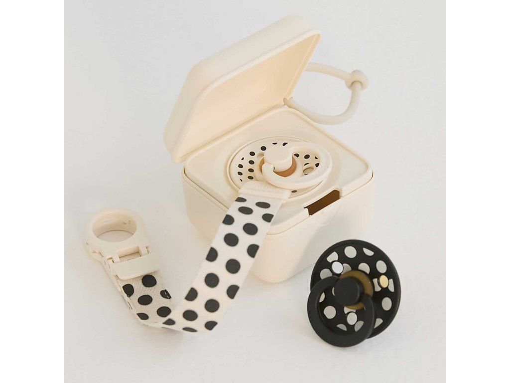 A BIBS egy népszerű dán márka, amely 1978 óta gyárt ikonikus cumikat. A cumikon kívül a BIBS a legkisebb gyermekek számára is kínál változatos, prémium termékeket minimalista skandináv dizájnban és széles színválasztékban. Minden BIBS termék garantálja a gyermektermékek legmagasabb minőségét. A BIBS Studio kollekciót az aktuális dizájntrendek ihlették, innovatív módon kísérletezik a nyomtatással, így a BIBS továbbra is trendeket határoz meg a szülőségben. Doboz, tároló, tok, csomagolás, ... egyszerűen egy segédeszköz, amely megvédi a cumit a szennyeződéstől, amikor éppen nincs rá szükséged. De nem csak ennyi... A BIBS STUDIO cumisüveg doboza egyben sterilizáló doboz is a szilikon cumisüvegek mikrosütőben történő sterilizálásához, vagy praktikus doboz minden apróság számára, amit kéznél szeretne tartani, bárhol is van. Mivel biztonságos, élelmiszeripari anyagból készült, alkalmas apró rágcsálnivalók tárolására is. A praktikus szilikon pántnak köszönhetően a BIBS cumisdobozt a táskádra, a babakocsira, az ágyra vagy az autósülésre rögzítheted. Betét nélkül akár 3 cumi is elfér benne. Betéttel 1 cumi és egy cumicsipesz fér el benne. Az egyik oldalon a betét a kerek formájú cumisüvegekhez készült, mint például a BIBS Colour, DeLux vagy Boheme, és elforgatva alkalmas a pillangó alakú cumisüvegekhez, mint a BIBS Supreme, Couture, Infinity. Szilikon cumi sterilizálására használható mikrohullámú sütőben. 100%-ban biztonságos, élelmiszeripari anyagból készült, ezért a doboz apró harapnivalók tárolására is alkalmas. Dániában tervezték és gyártották. A képen látható cumi nem tartozék. Tanúsítványok: Megfelel az EN 15284, EN 1186-01, EN 1186-03, EN 1186-14 európai szabványoknak. Útmutató a cumik BIBS dobozban történő sterilizálásához: Adjon két evőkanál vizet a cumisdobozhoz, és tegye bele a cumit. Helyezze a dobozt a mikrohullámú sütőbe kb. 60 másodpercre, maximum 800 W-on. A hőmérséklet nem haladhatja meg a 100°C-ot. Tartsa be a mikrohullámú sütő gyártójának utasításait. A cumi kivétele előtt hagyja a dobozt 2 percig hűlni. Javasoljuk, hogy mikrohullámú sütőben csak szilikon cumikat sterilizáljon, természetes gumiból készült cumikat ne. Legyen óvatos! Sterilizálás közben a terméket gyermekektől elzárva kell tartani. Méret: kb. 7,5 x 7,2 x 5 cm.