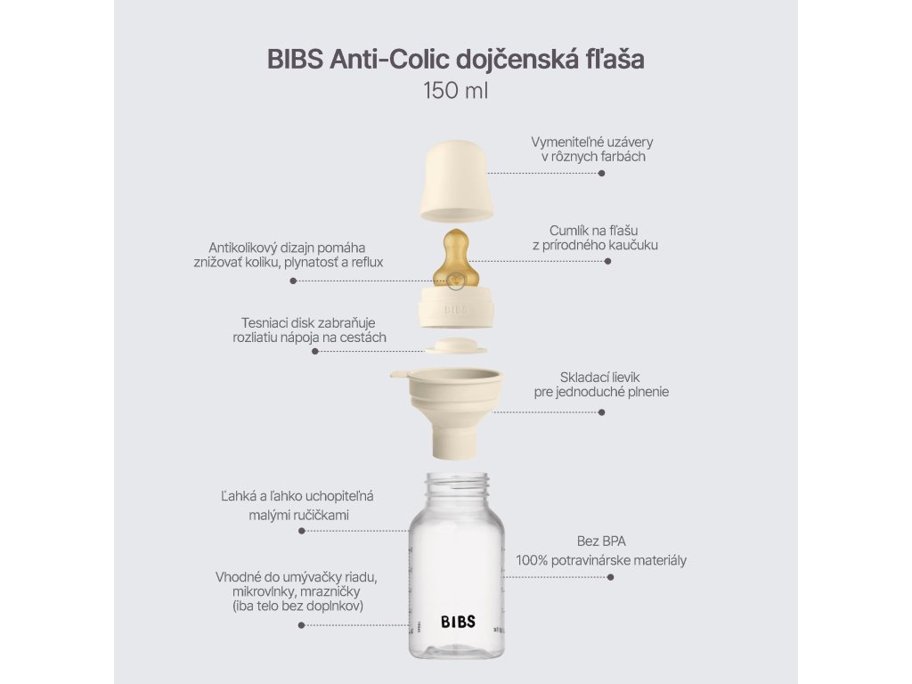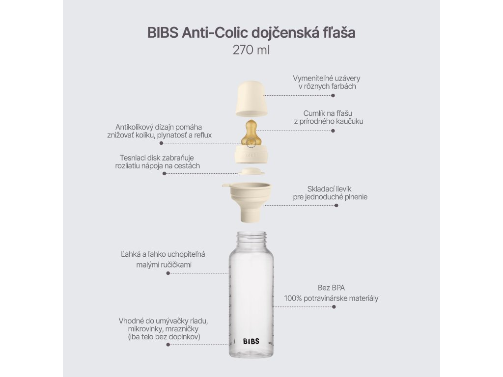 A BIBS egy népszerű dán márka, amely 1978 óta gyárt ikonikus cumikat. A cumikon kívül a BIBS a legkisebb gyermekek számára is kínál változatos, prémium termékeket minimalista skandináv dizájnban és széles színválasztékban. Két darabos, kedvező árú BIBS hasfájás elleni cumisüveg és tartalék cumi csomag, amely lépést tart gyermeke változó igényeivel és növekvő étvágyával. Praktikus ajándék leendő vagy friss anyukáknak. Népszerű cumisüveg elegáns dizájnnal, Red Dot Design Award díjjal. 2 BPA- és ftalátmentes élelmiszeripari PP palack - 150 ml és 270 ml. 4 különböző áramlású természetes gumi cumi - lassú áramlás (150 ml-es palack), közepes áramlás (270 ml-es palack) és 2 x gyors áramlás (tartalék cumi csomag). Anti-Colic dizájn – az egyedi, szívecske alakú hasfájás elleni szelep segít megelőzni a puffadást, a refluxot és a kólikát, és támogatja a tej egyenletes áramlását a boldogabb pocakokért. A népszerű, kerek cumi forma az anya mellbimbójának formájára emlékeztet, támogatja a nyelv hasonló elhelyezkedését és a helyes aktív szívási technikát, mint szoptatáskor, és ezáltal megkönnyíti a szoptatás és a cumisüvegből való táplálás váltogatását. A természetes gumi rendkívül rugalmas, finom és puha, mint a bőr, ellenáll a repedések kialakulásának és a kis darabok leválásának. Praktikus kiegészítők a csomagban (összecsukható tölcsér, 2x tömítő korong). Könnyű tisztítás - mosogatógépben, mikrohullámú sütőben, fagyasztóban is használható (a cumisüveg és a tölcsér kivételével). Kiváló minőség – minden alkatrész Európában készül, 100%-ban élelmiszeripari anyagokból, BPA és egyéb káros anyagok nélkül. 100%-ban újrahasznosítható. A CSOMAG TARTALMA: 1x BIBS antikolikus cumisüveg kaucsuk cumisüveggel 150 ml (lassú áramlás)*. 1x BIBS antikolikus cumisüveg kaucsuk cumisüveggel 270 ml (közepes áramlás)*. 1x BIBS antikolikus kaucsuk cumisüvegek (2x gyors áramlás). 1x összecsukható tölcsér a palack gyors és egyszerű feltöltéséhez. *Minden palackhoz tartozik cumisüveg, fedél, gyűrű és tömítő korong. MIX&MATCH: A komplett cumisüveg mellett, amely mindent biztosít, ami a kényelmes cumisüveges etetéshez szükséges (palack, cumisüveg, gyűrű, fedél, tömítő korong és tölcsér), különálló tartalék palack (150 ml vagy 270 ml) és különálló palackzáró készlet (gyűrű, fedél és tömítő korong különböző színekben) is kapható. Így összeállíthatja a palackot gyermeke igényeinek és saját preferenciáinak megfelelően. A BIBS természetesen kínál tartalék cumisüvegeket kaucsuk és szilikon kivitelben is, különböző áramlási sebességekkel (lassú, közepes, gyors). HASZNÁLAT: Első használat előtt sterilizálja a palack minden alkatrészét forrásban lévő vízben 5 percig, majd szükség szerint sterilizálja. Rendszeresen ellenőrizze a cumisüvegeket, és szükség szerint cserélje ki őket (kaucsuk esetében kb. 1-2 havonta), vagy hamarabb, ha sérültek. Ne tegye ki a cumit közvetlen napfénynek vagy más hőforrásnak. A palack minden alkatrésze, a tölcsér és a cumisüveg kivételével, mosogatógépben mosható a felső kosárban. A cumli tisztításához ne használjon éles tárgyakat. A BIBS palackok megfelelnek az EN 14350:2020 európai szabványnak.