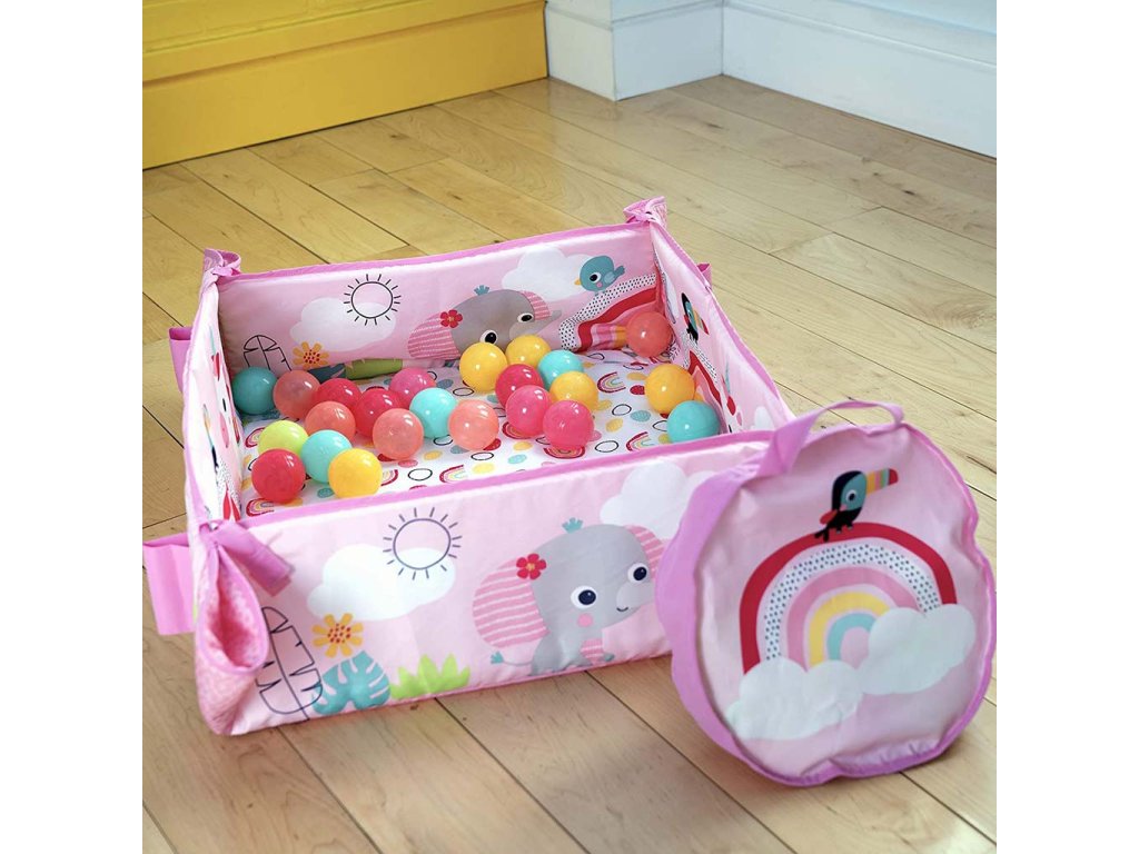 A takaró plüss oldalfalai felfelé állíthatók, és a játszótér 40 színes labdával megtölthető, így járókaként szolgál, hogy ne guruljanak szét az egész szobában. Anya és apa is bekapcsolódhat az akcióba, ha labdákat dobnak a hálós tetőn lévő lyukon keresztül.