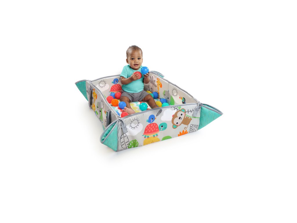A takaró plüss oldalfalai felfelé állíthatók, és a játszótér 40 színes labdával megtölthető, így járókaként szolgál, hogy ne guruljanak szét az egész szobában. Anya és apa is bekapcsolódhat az akcióba, ha labdákat dobnak a hálós tetőn lévő lyukon keresztül.