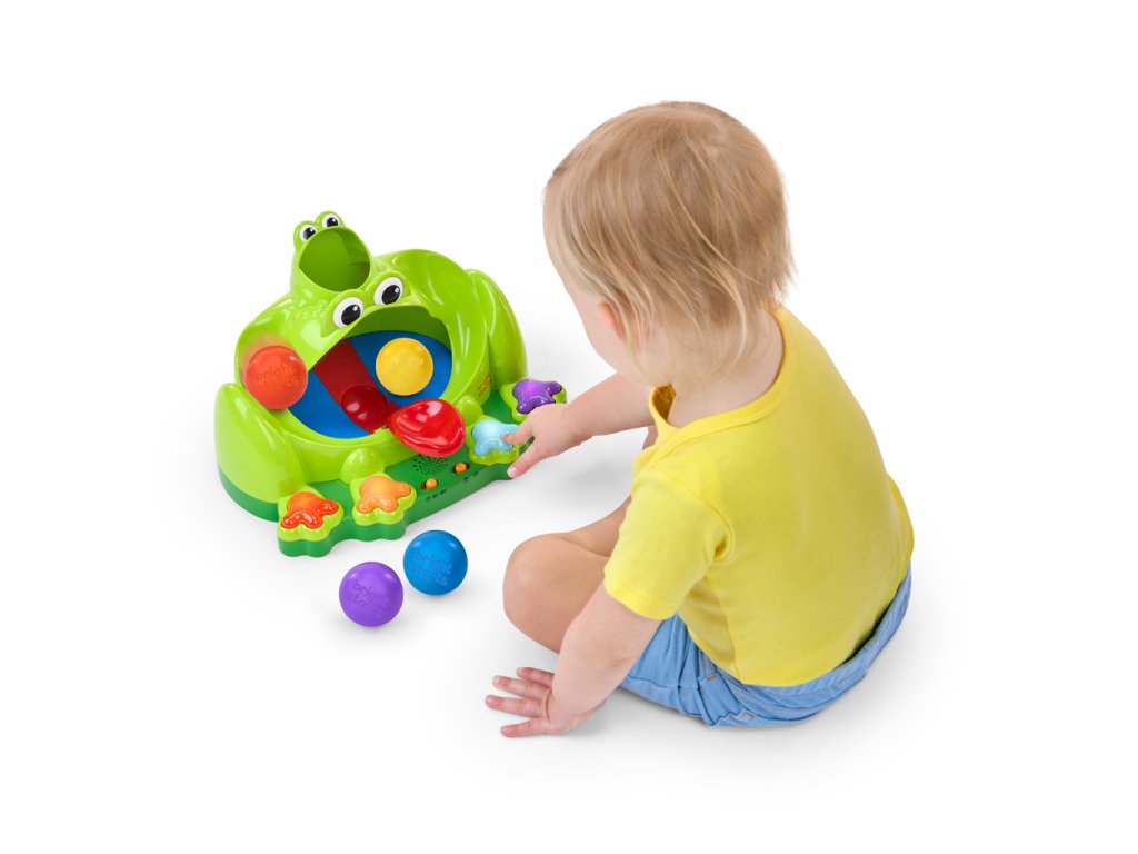 - Nyomja meg a béka 4 színes lábának egyikét a fények és az 50+ dallam/hang aktiválásához; a béka szájában beépített trambulin mechanizmus található, amely elkapja a pattogó labdákat játék közben
