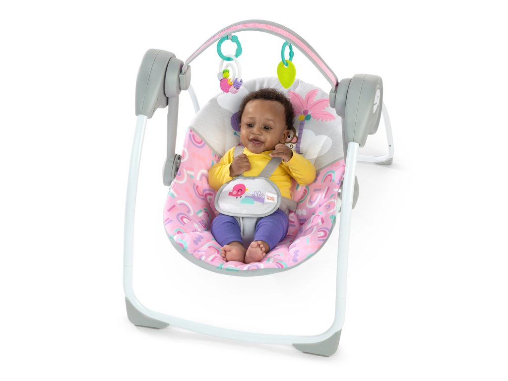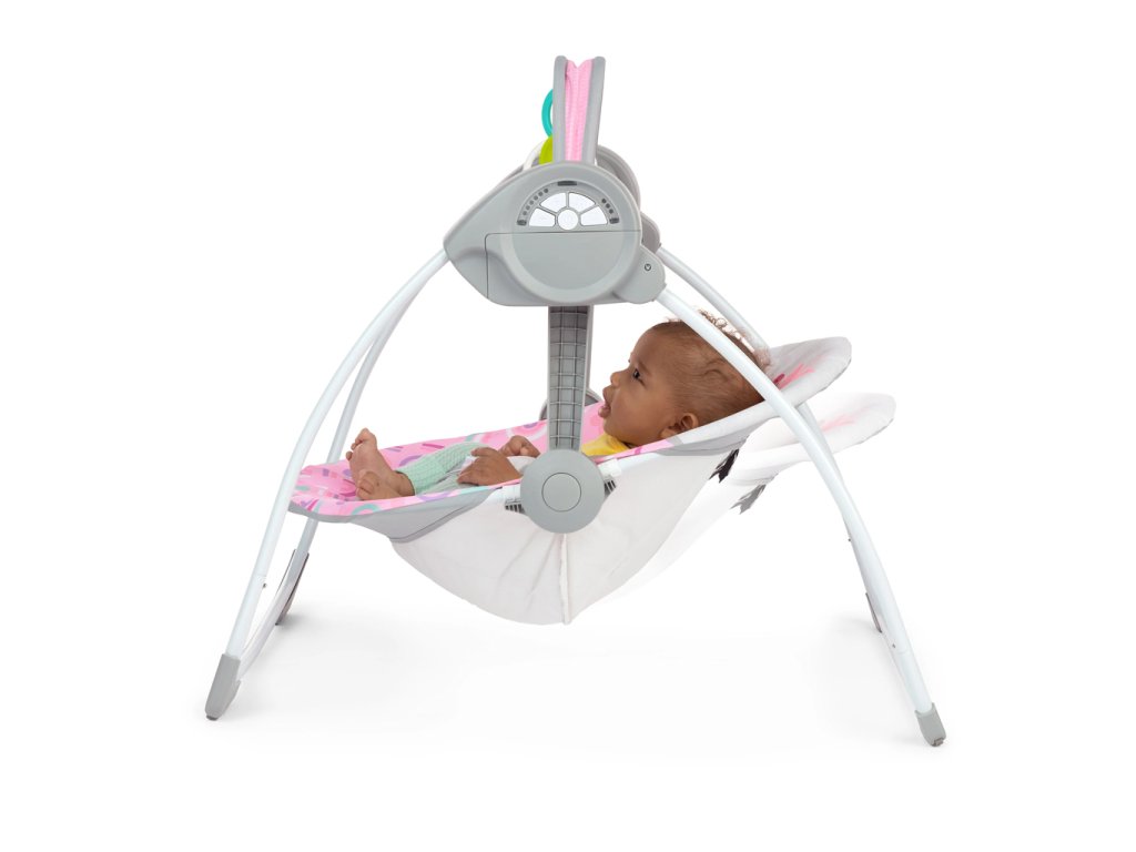 - A Bright Starts Pink Paradise hordozható hinta könnyű és összecsukható kialakítású, ideális tároláshoz vagy utazáshoz; könnyen hordozható útközben