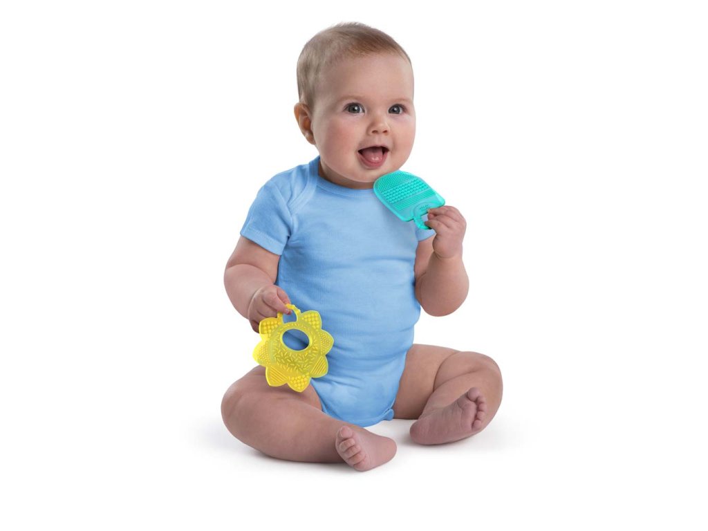 A fájó íny megnyugtatása soha nem volt egyszerűbb, mint a Bright Starts új, többrétegű, napocska és jégkrém alakú Sunny Soothers rágókáival. A sörtés kialakítás masszírozza a baba ínyét, amikor a fogai kezdenek kibújni. A BPA-mentes anyagnak és a könnyen megfogható formának köszönhetően a baba beleharaphat a napocskába vagy a jégkrémbe, és enyhítheti a fogzás okozta fájdalmat, ami nagyon fájdalmas lehet!
