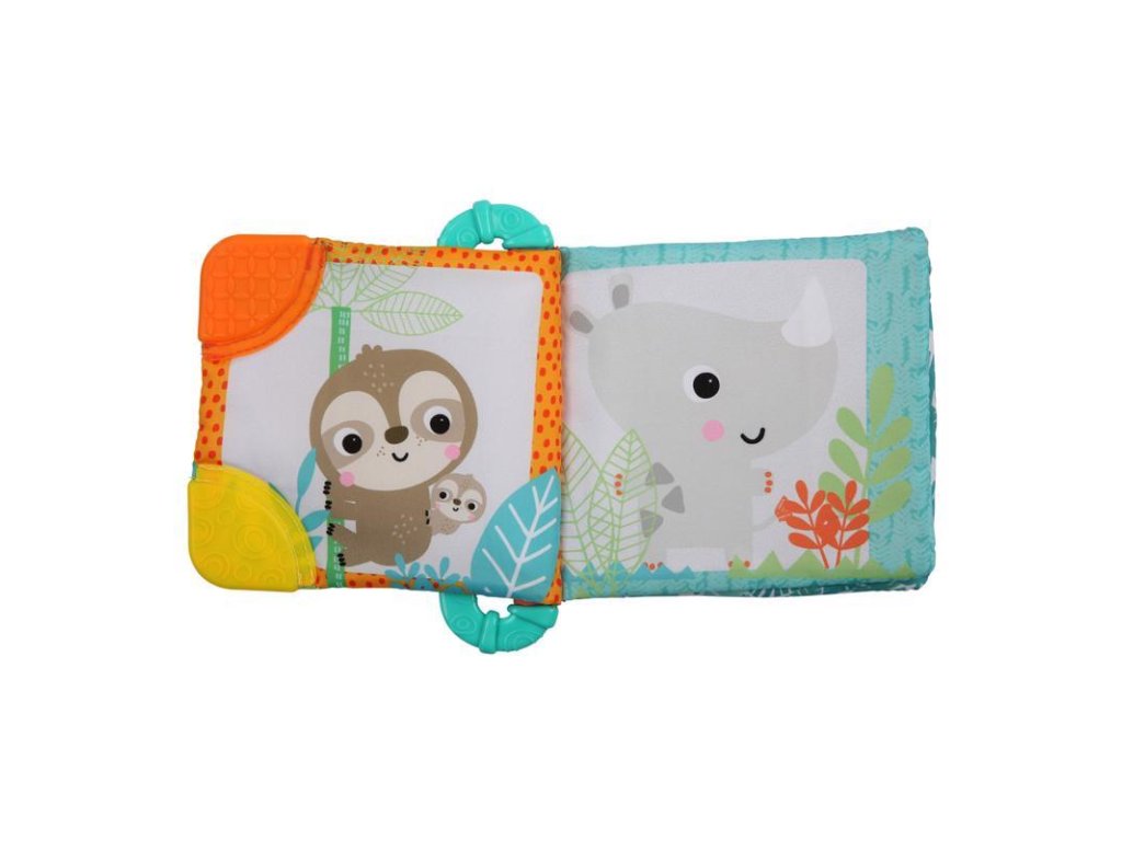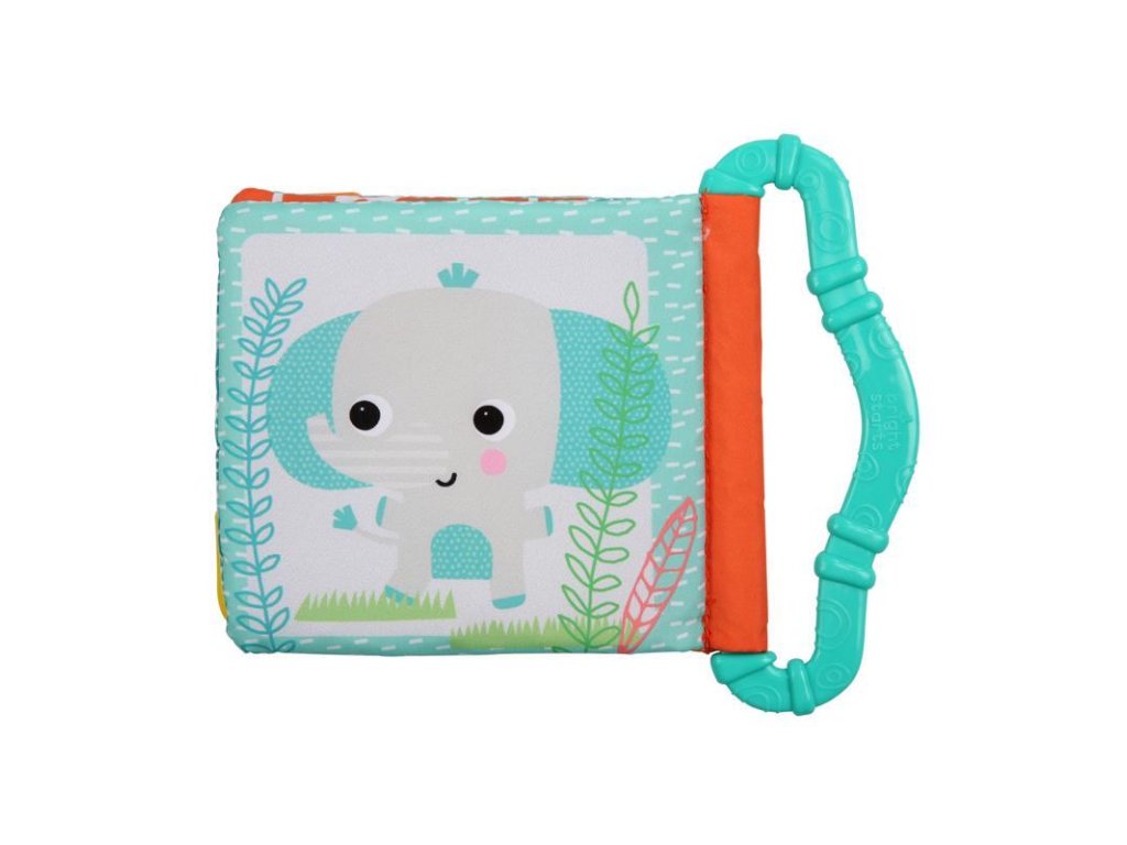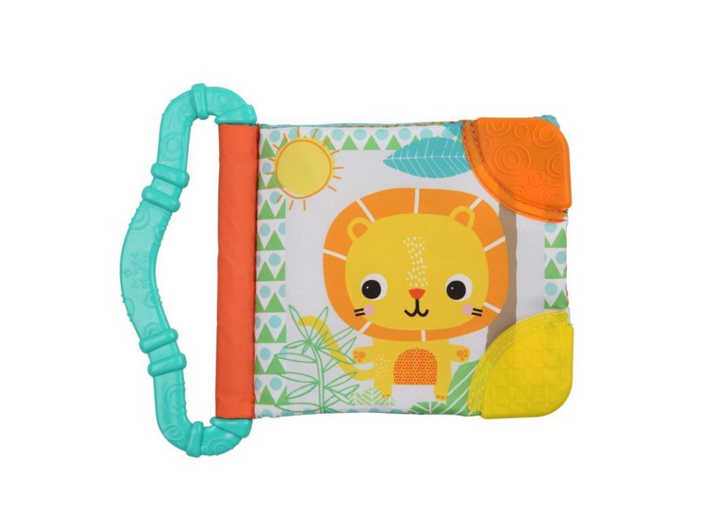 A textil könyv 3 hónapos kortól alkalmas. A kalandokkal teli oldalakon színes képek és minták találhatók, amelyek serkentik a látást. A susogó oldalak és a különféle anyagok felfedezésre csábítják a babát. A könyv bal oldalán egy hullámos rágóka-tartó található, amelyen két karika van, amelyek rázáskor csörögnek, ugyanakkor segítenek a fogzáskor megnyugtatni az ínyt.