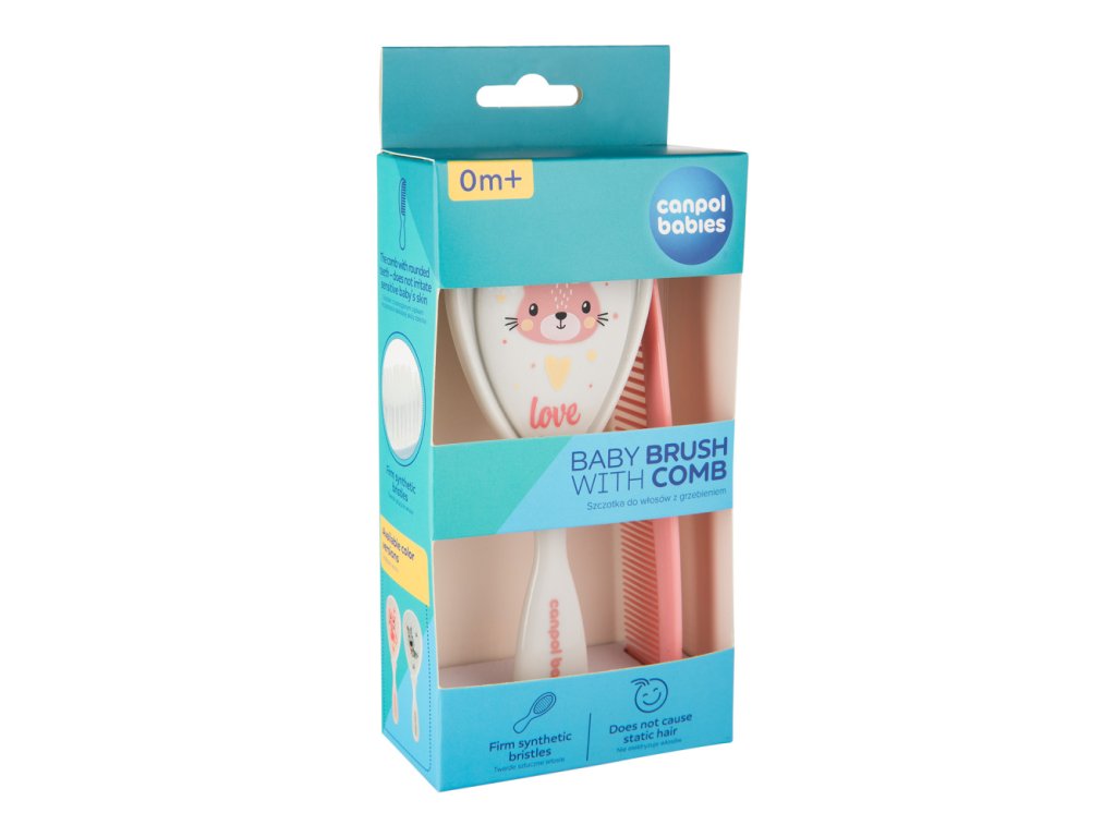 Hajszálkefe fésűvel a kisgyermek hajának mindennapi ápolásához. A fésű lekerekített fogakkal rendelkezik, amelyek nem irritálják az érzékeny bőrt. A puha, szintetikus sörtékkel ellátott kefe finoman masszírozza a kisgyermek fejét anélkül, hogy elektrosztatikussá tenné a haját. A készlet két változatban kapható.