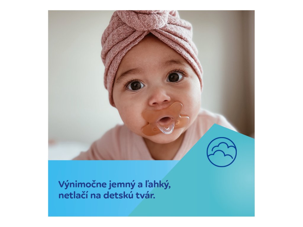 A 100%-os szilikon cumi megnyugtatja és megnyugtatja a babát. A cumi rendkívül puha és könnyű, és nem hagy nyomot a baba arcán. 100%-ban hipoallergén szilikonból készült – íz és szag nélkül. A szimmetrikus formájú puha, rugalmas hegy jól illeszkedik a baba szájába, függetlenül attól, hogy hogyan helyezkedik el, és formája a legtermészetesebbnek számít. A szimmetrikus cumihegy a legtöbb gyermek számára a legkönnyebben elfogadható. Kizárólag egy darab rugalmas szilikonból készült, amely nagyon tartós, nem deformálódik, nem szárad ki és nem színeződik el. A cumi selymesen puha szilikon bevonatának köszönhetően kellemes a bőrnek. A speciálisan kialakított pajzsforma jól illeszkedik a baba arcához, és lehetővé teszi a könnyű orrlégzést.