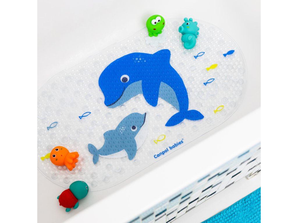 A csúszásgátló, tapadókorongos alátét megvédi a babát a kádban való elcsúszástól. Kiváló minőségű, átlátszó gumiból készült, és színes LOVE&SEA motívum díszíti.
