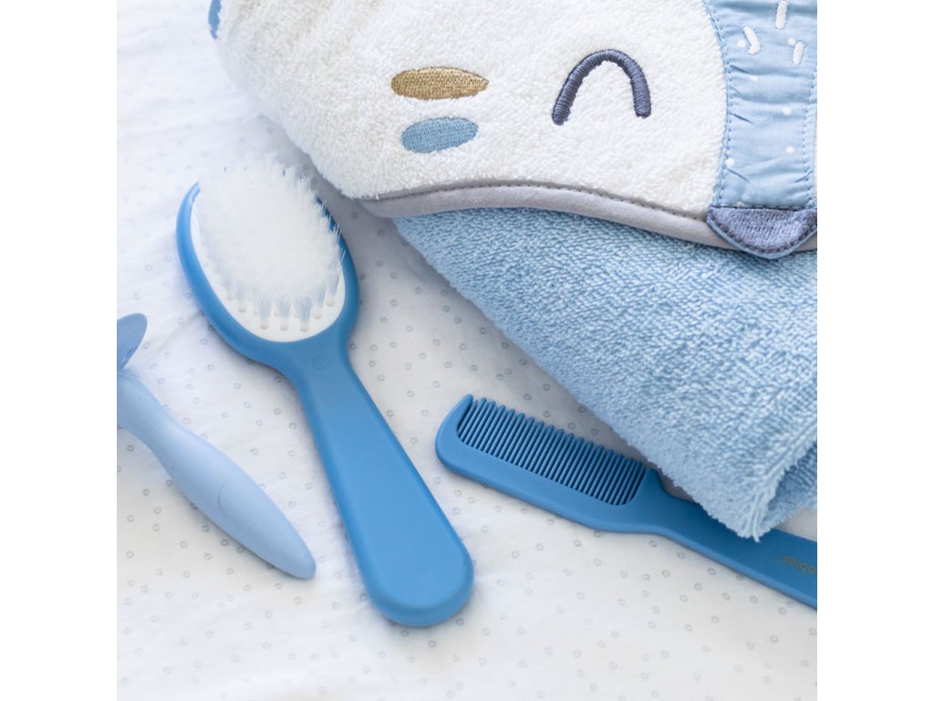 A gyermek hajkefe és fésű tökéletes készletet alkot a baba első hajszálainak fésüléséhez és a fejbőr masszírozásához. A fésű fogai lekerekítettek, hogy ne irritálják a baba érzékeny bőrét, míg a kefe szintetikus sörtéi garantálják a puha babahaj biztonságos és kellemes ápolását. Az eszközök ergonomikus formája megkönnyíti a kényelmes használatot, a speciális fésűtartó pedig segít a rend fenntartásában. A készlet három pasztellszínben kapható.