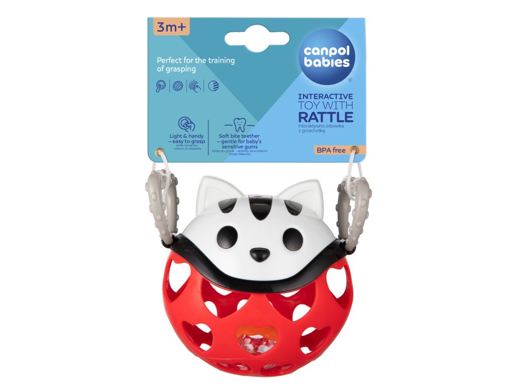 A játék különböző textúrákkal és kontrasztos színekkel rendelkezik, amelyek serkentik a gyermek érzékeit. A rugalmas és könnyen megfogható elemek megkönnyítik a játék tartását és eldobását. Az áttetsző elemeken keresztül látható, színes golyókkal ellátott csörgő mindenképpen felkelti a kíváncsiságot, és játékra ösztönzi a kisgyermeket. A rugalmas, kiálló fogantyúk enyhítik az íny viszketését.