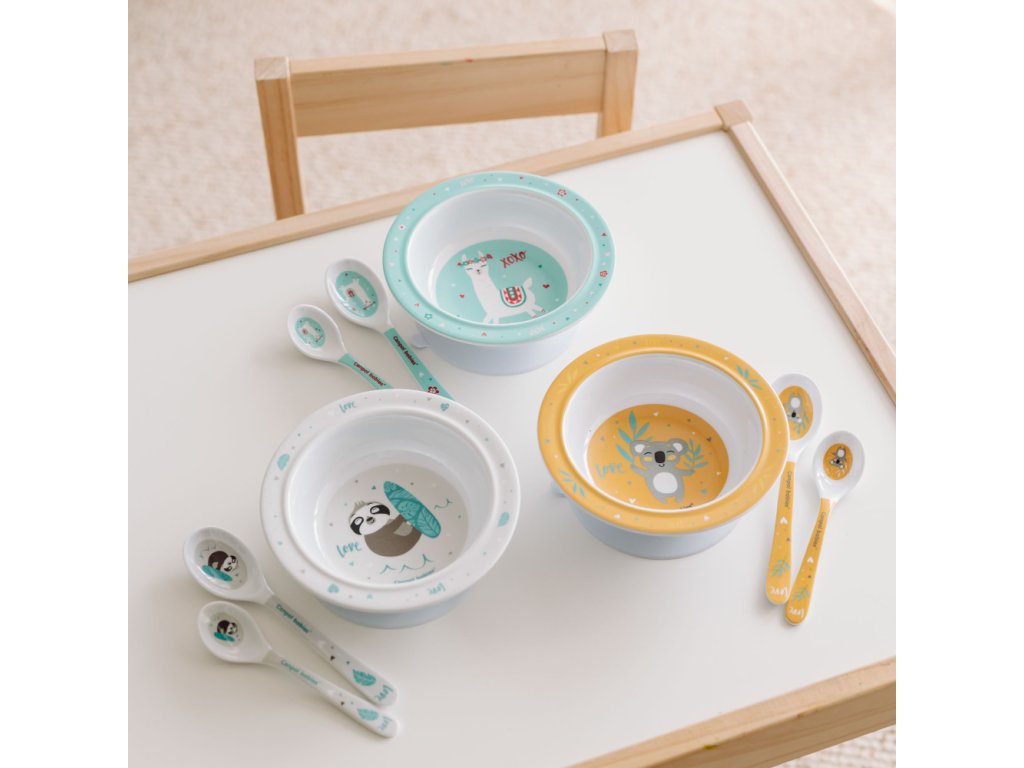 EXOTIC ANIMALS etetőkanál készlet. Karcálló melaminból. A lekerekített formák nem irritálják a baba érzékeny ínyét. A kanalak színes nyomatokkal rendelkeznek, amelyek további vonzerőt jelentenek a gyermek számára evés közben. A készlet két kanalat tartalmaz: egy kicsit és egy nagyot. 9 hónaposnál idősebb gyermekek számára alkalmas.