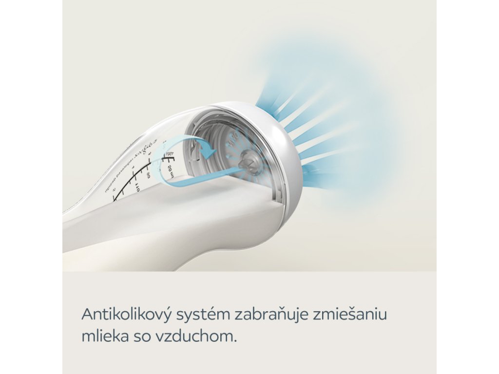 A palack alján található antikolikos rendszer megakadályozza a tej és a levegő keveredését.
